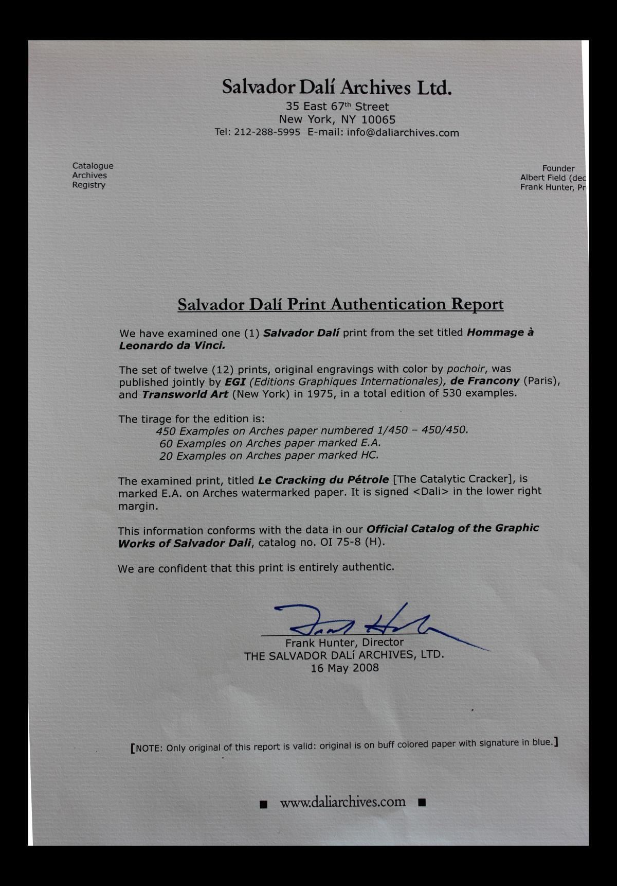 Artist: Salvador Dali. Medium: Original Engravings with color by pochoir. Title: The Catalytic Cracker. Size (Unframed): 22" x 30". Certificate of Authenticity: From Frank Hunter. Reference# 10455.
