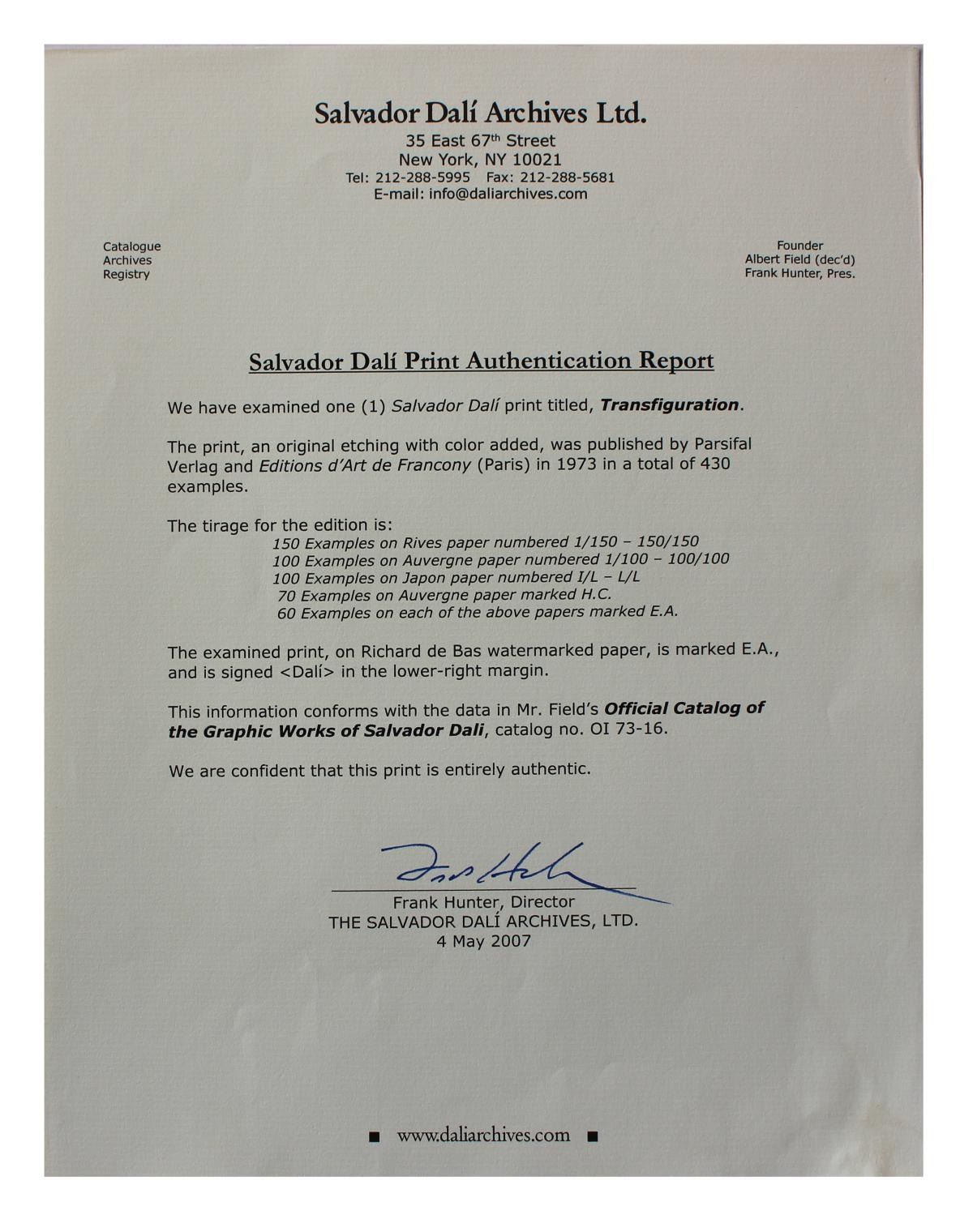 Artist: Salvador Dali. Medium: Original Etching with color Added. Title: Transfiguration. Size (Unframed): 30" x 22". Certificate of Authenticity: From Frank Hunter. Reference# 10479.