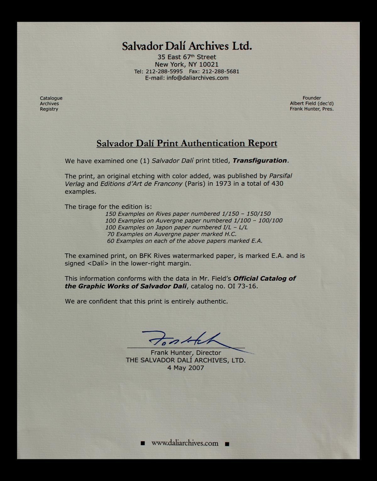 Artist: Salvador Dali. Medium: Original Etching with color Added. Title: Transfiguration. Size (Unframed): 30" x 22". Certificate of Authenticity: From Frank Hunter. Reference# 10457.