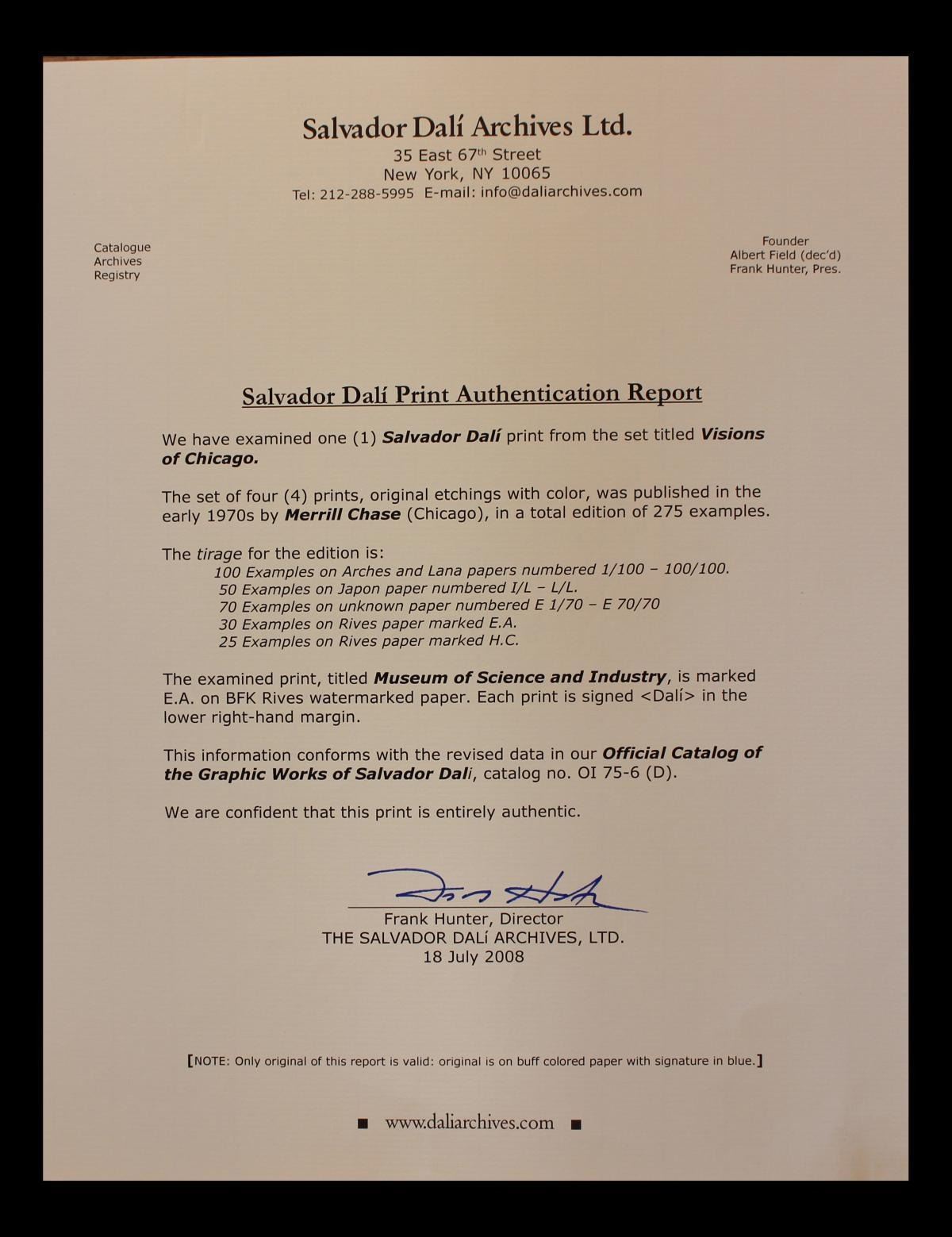 Artist: Salvador Dali. Medium: Original Etching with color. Title: Museum of Science and Industry. Size (Unframed): 19.5" x 25.5". Certificate of Authenticity: From Frank Hunter. Reference# 10462.