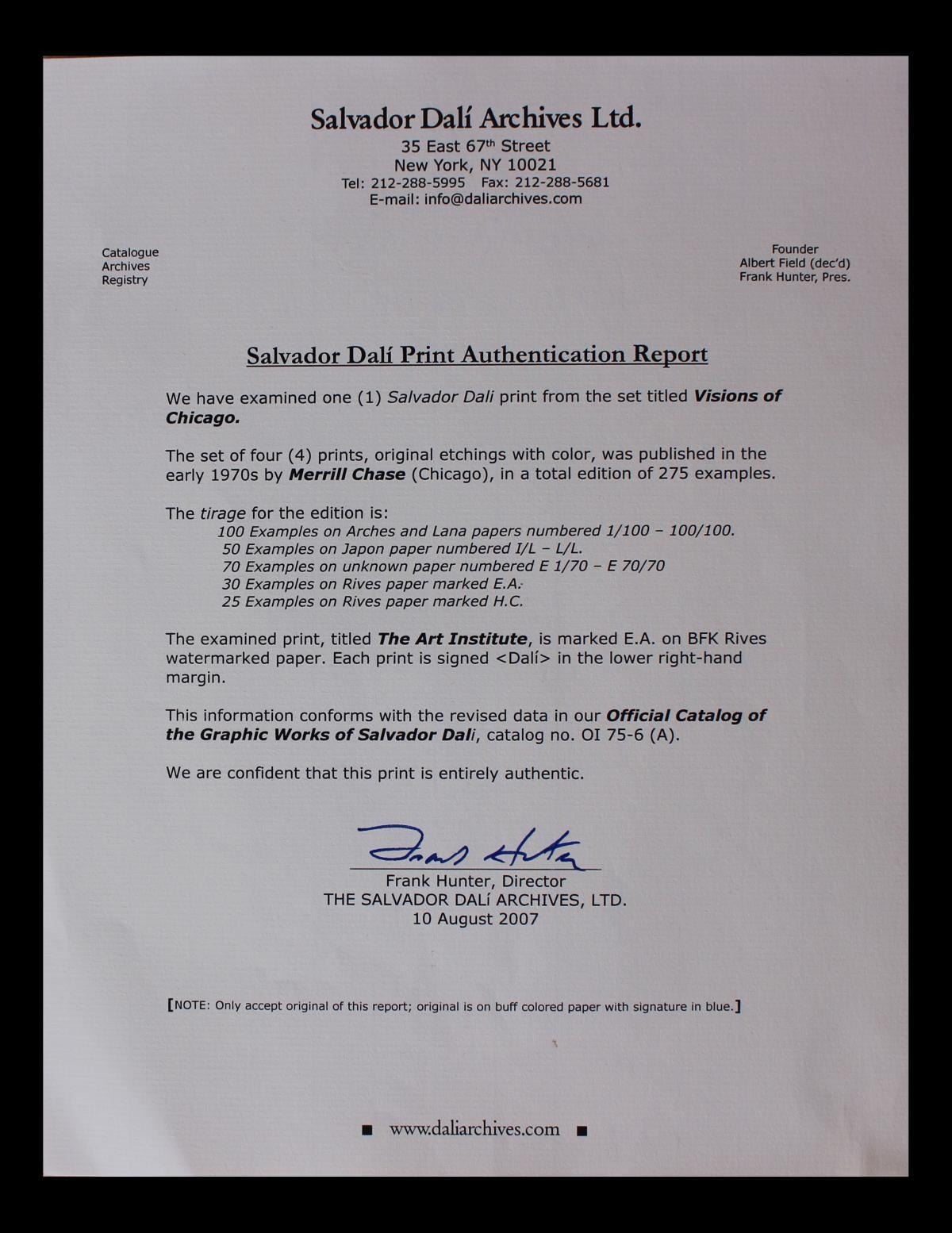 Artist: Salvador Dali. Medium: Original Etching with color. Title: The Art Institute. Size (Unframed): 25.5" x 19.5". Certificate of Authenticity: From Frank Hunter. Reference# 10464.