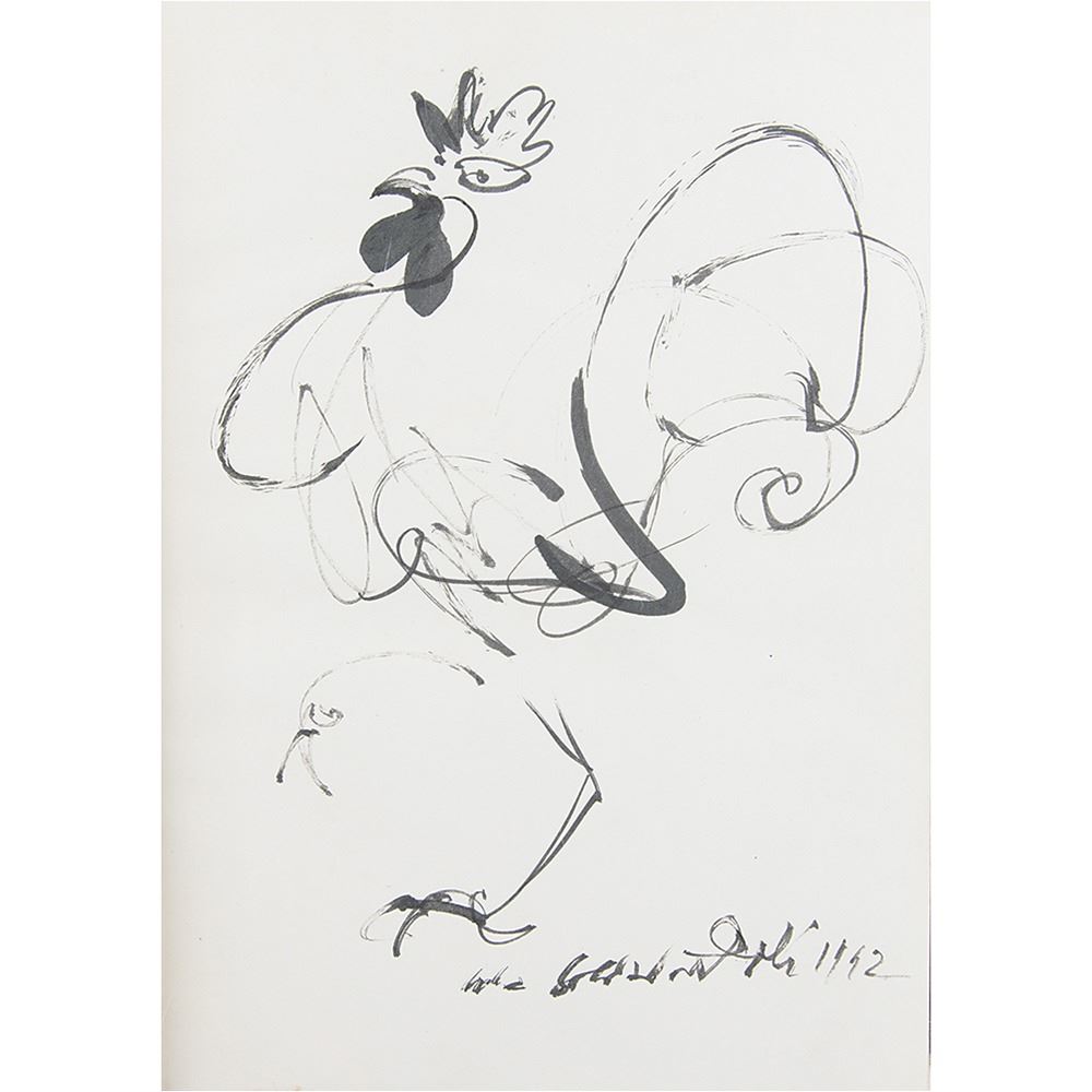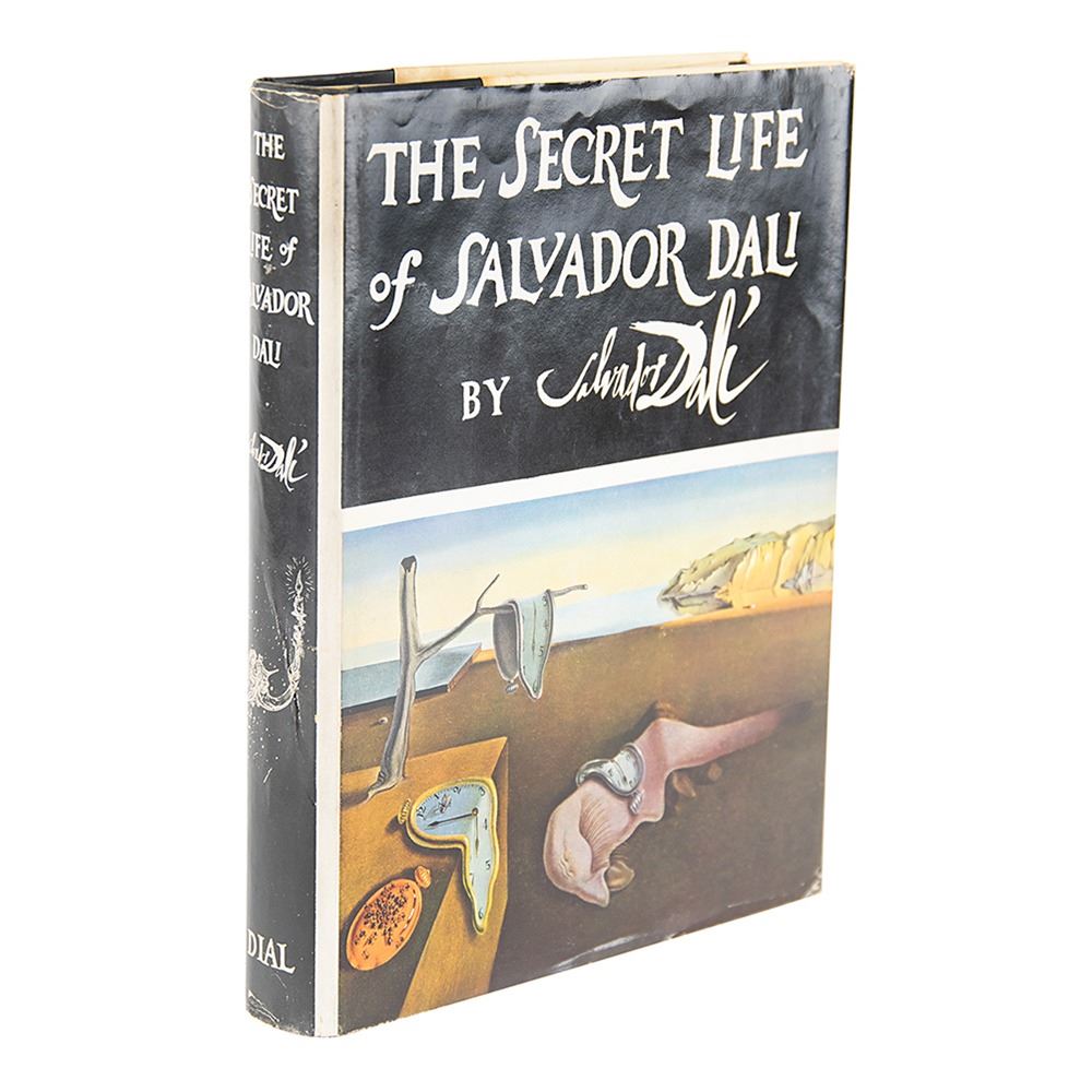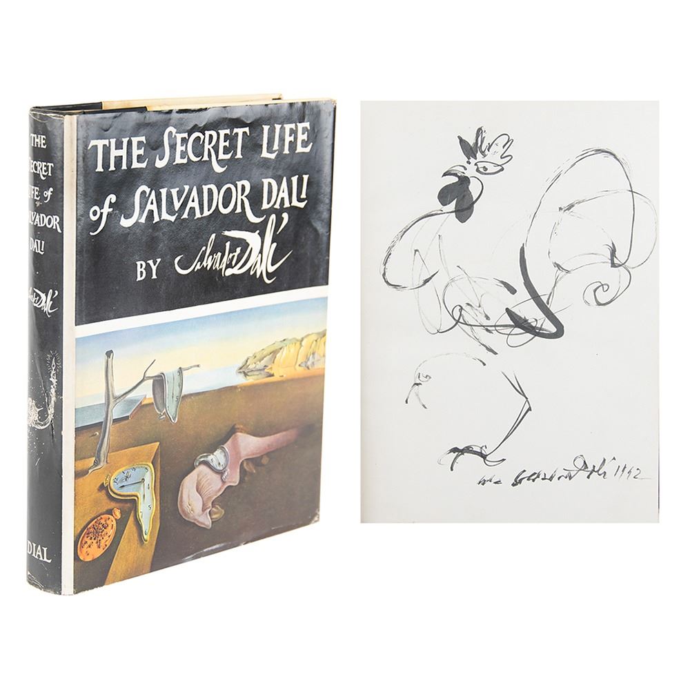 Signed book: The Secret Life of Salvador Dali. First edition, limited issue, numbered 76/119. NY: Dial Press, 1942. Hardcover with dust jacket and partial slipcase, 8 x 10.25, 400 pages. Signed in full and dated opposite the colophon in black ink, "Salvador Dali, 1942," with the addition of a fantastic full-page sketch of a rooster. Autographic condition: fine. Book condition: VG-/VG, with cracked hinges, light scattered foxing throughout, clipped from jacket flap; the partial slipcase retains one side panel (complete with image of Dali's iconic 'The Persistence of Memory') and the bottom panel, with the top panel detached, and back and opposite side missing. A significant sketch in a highly limited book by the Surrealist master.