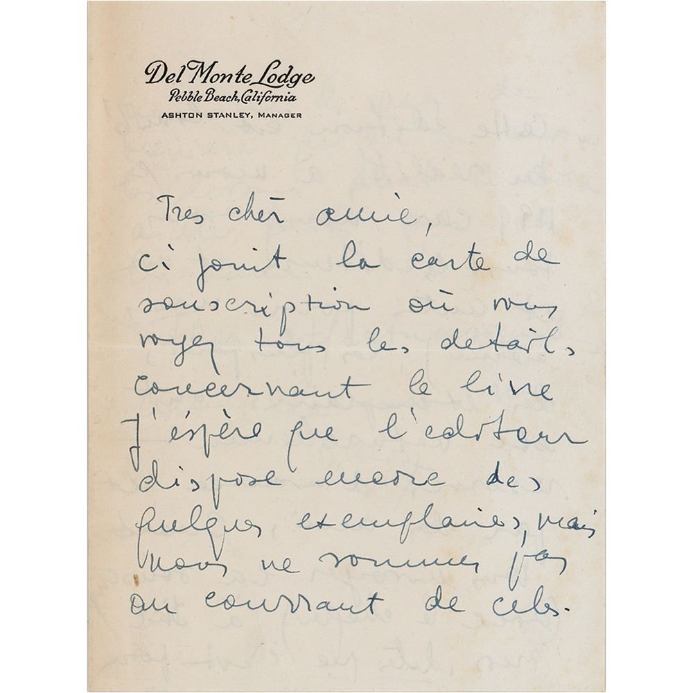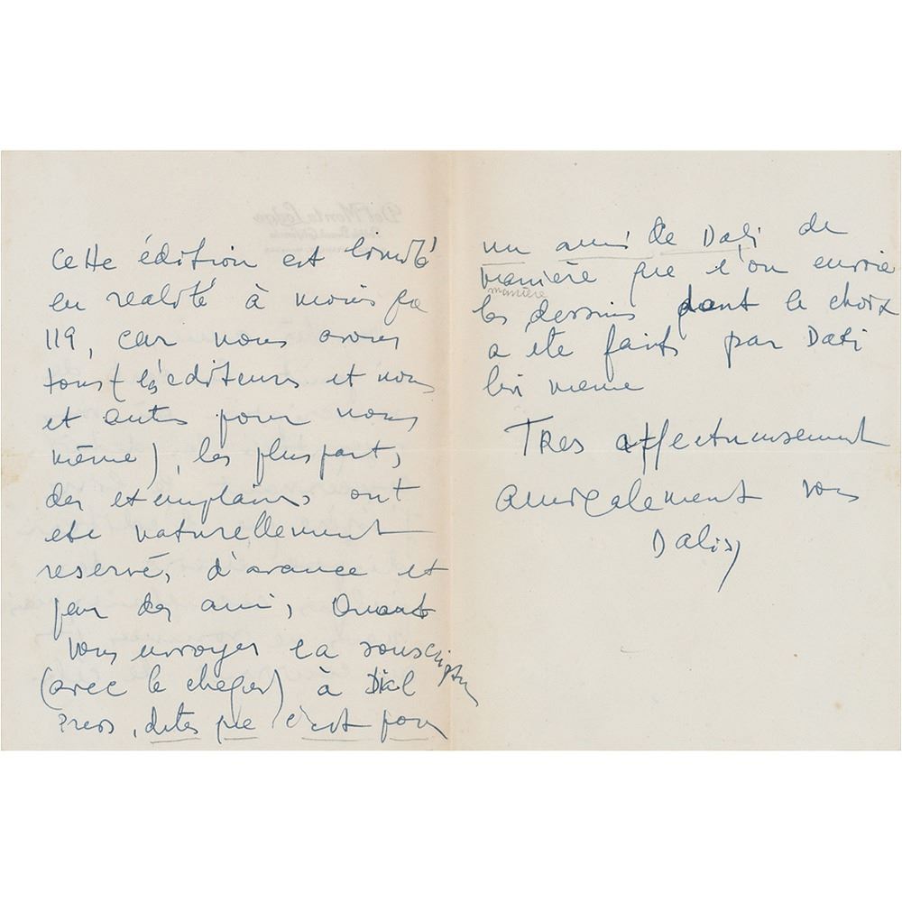 Accompanied by an autograph letter signed by Dali's wife, Gala, in part (translated): "Here is the subscription card where you can see all the details concerning the book. I’m hoping that the editor will issue some more examples but we are not aware of this happening. This edition is, in reality, limited to at least 119, because we have them all (the editors, us, and some for ourselves). Most of the examples are naturally reserved in advance by our friends. When you send the subscription with a check to Dial Press say that it’s for a friend of Dali’s in order to get an image of your choice drawn by Dali himself."