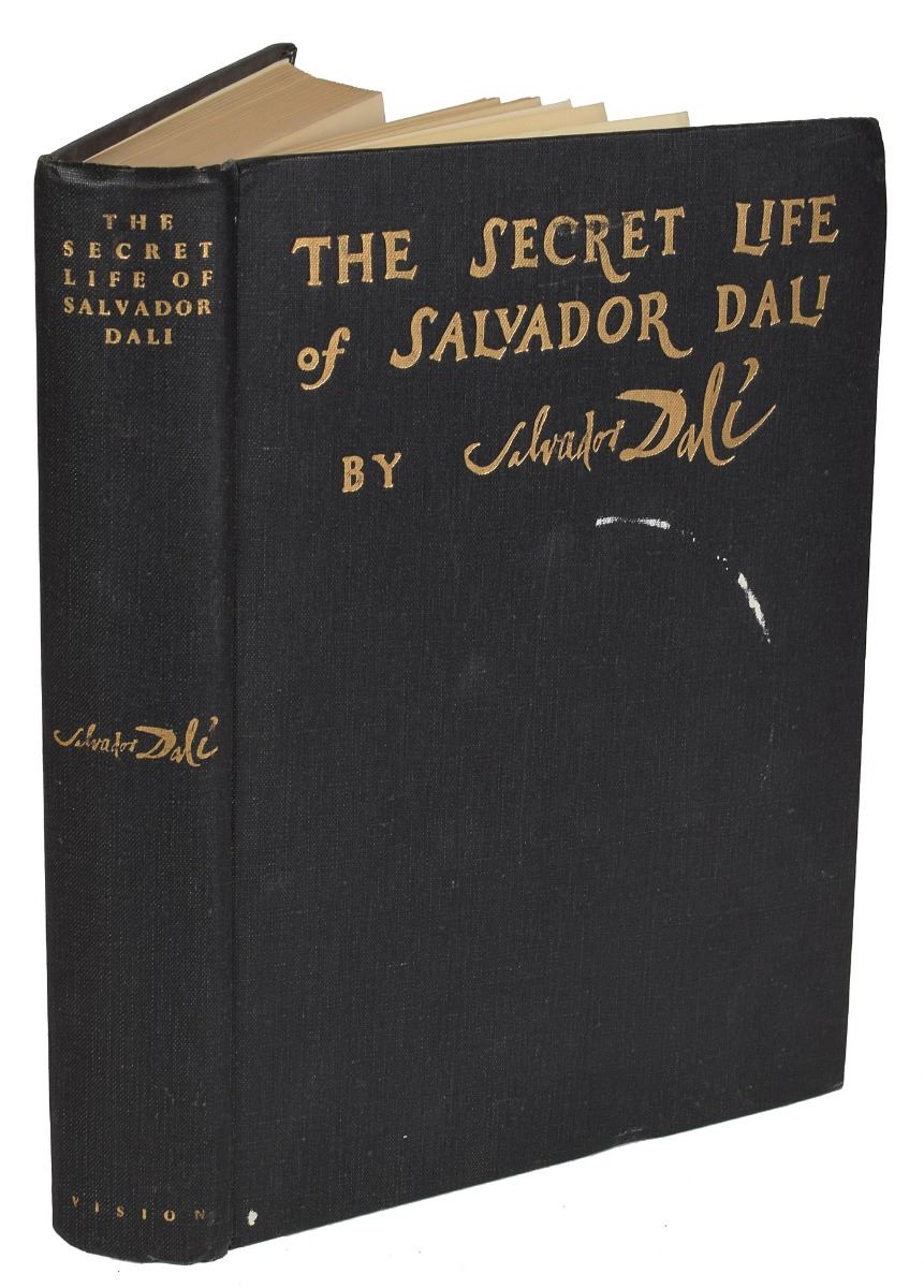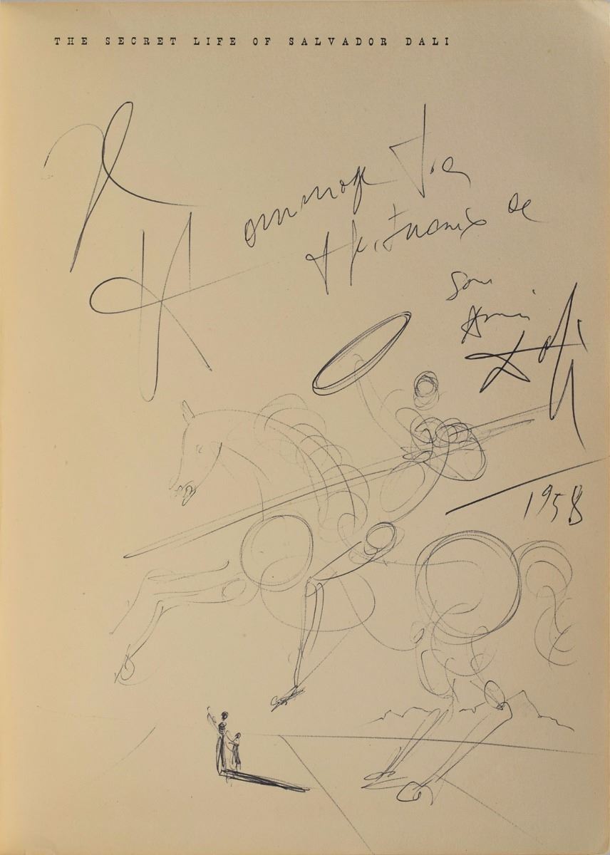 Signed book: The Secret Life of Salvador Dali. Third edition, limited issue of 1000. London: Vision Press, 1949. Hardcover, 7.75 x 10, 423 pages. Signed and inscribed in French on the half-title page and adjacent page in black ballpoint, "son ami, Dali, 1958," who adds a rare and brilliant sketch of Don Quixote atop a rearing Rocinante, with two small figures watching below and distant mountain peaks to either side. Autographic condition: fine. Book condition: VG/None. A fantastic and highly sought-after sketch of the surrealist master's now iconic take on Miguel de Cervantes' timeless novel. Pre-certified PSA/DNA.