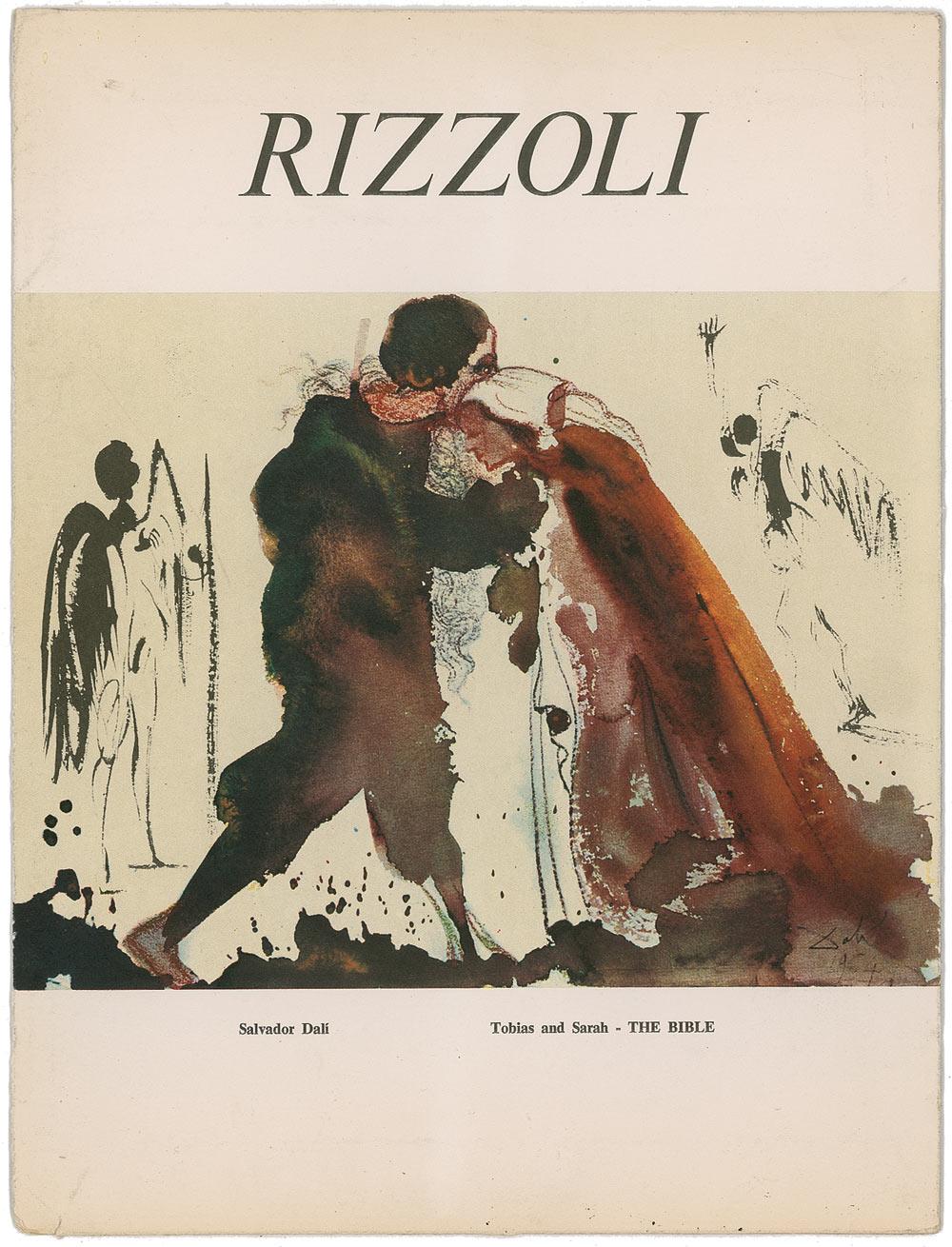 Rizzoli International Bookstore & Gallery folder, 8.5 x 11.5, featuring a color image of Dali's painting "Tobias & Sarah" on front cover, quickly signed on the back cover in blue felt tip by Dali. Mild toning and handling wear, and small corner tip creases, otherwise fine condition.