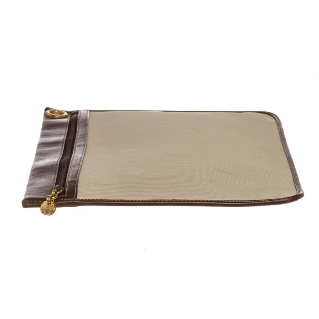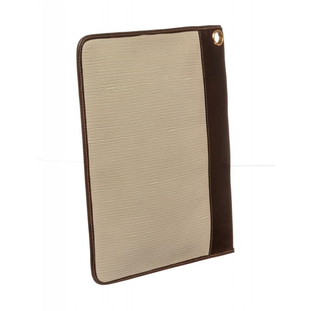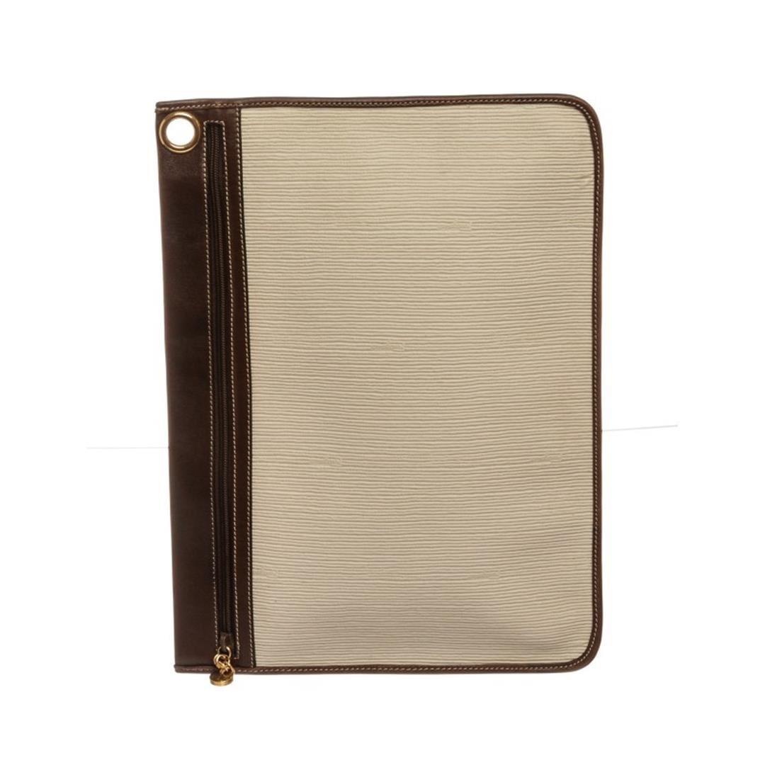 Crafted out of beige textured canvas and brown leather trim with gold-tone hardware. Inner black leather lining. Item is Pre-Owned.