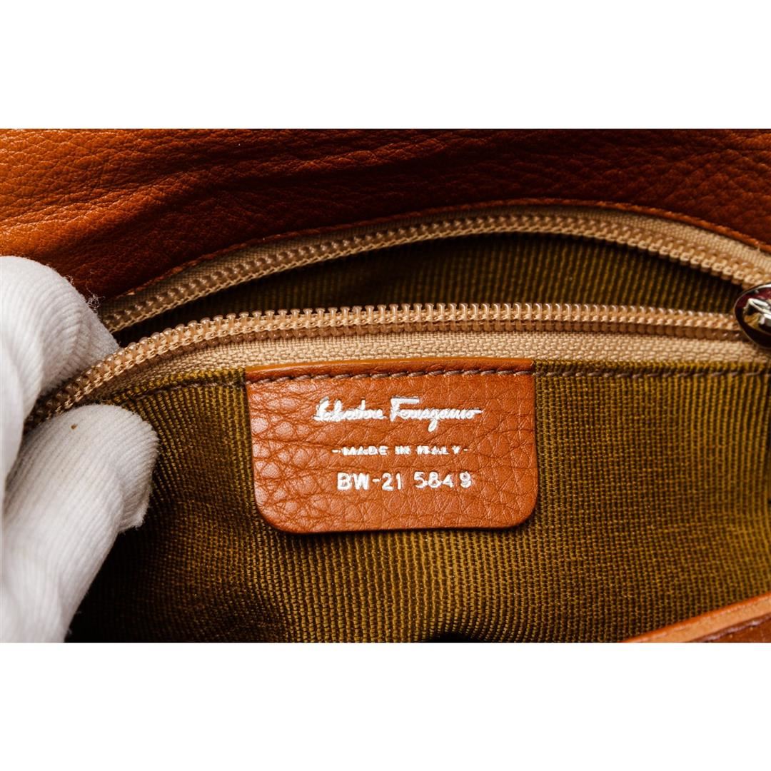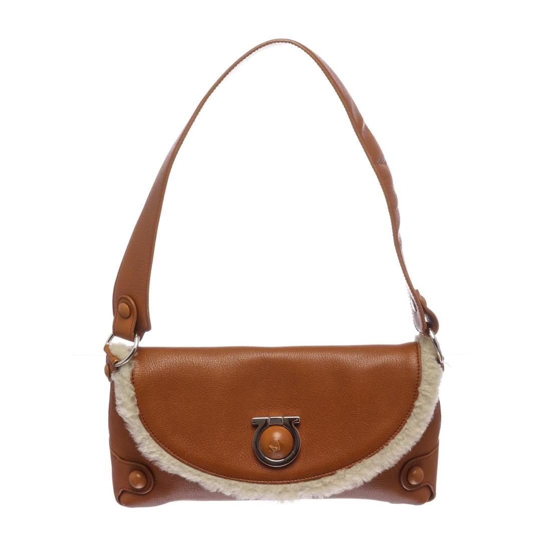 Crafted out of brown leather and beige shearling trim, silver tone hardware, single flat strap, magnetic snap closure. Inner brown fabric lining and side zip pocket.
