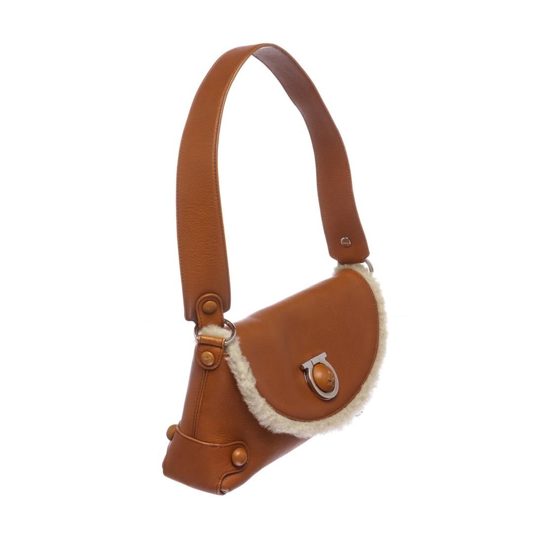 Crafted out of brown leather and beige shearling trim, silver tone hardware, single flat strap, magnetic snap closure. Inner brown fabric lining and side zip pocket.