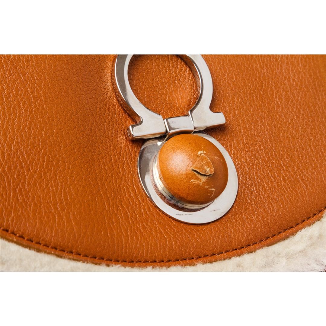 Crafted out of brown leather and beige shearling trim, silver tone hardware, single flat strap, magnetic snap closure. Inner brown fabric lining and side zip pocket.