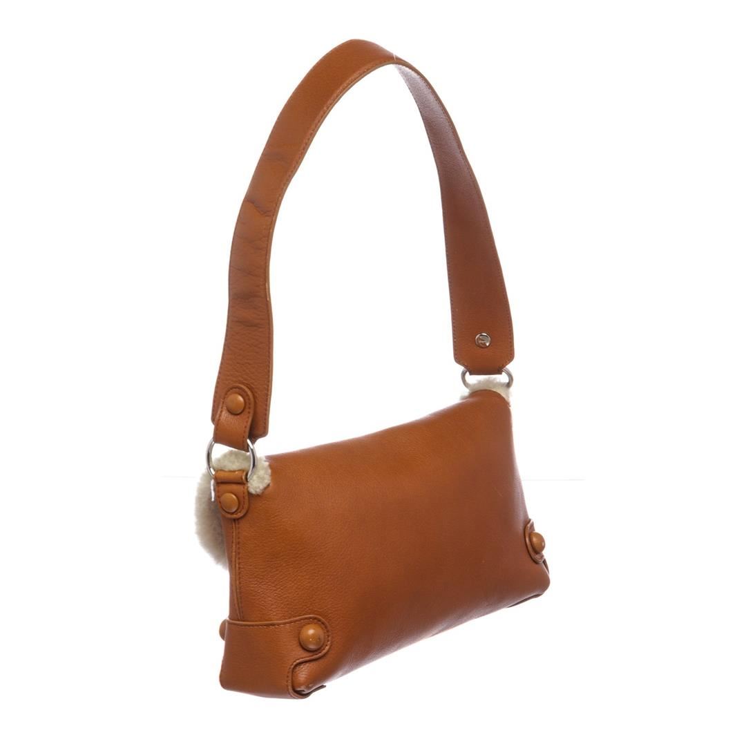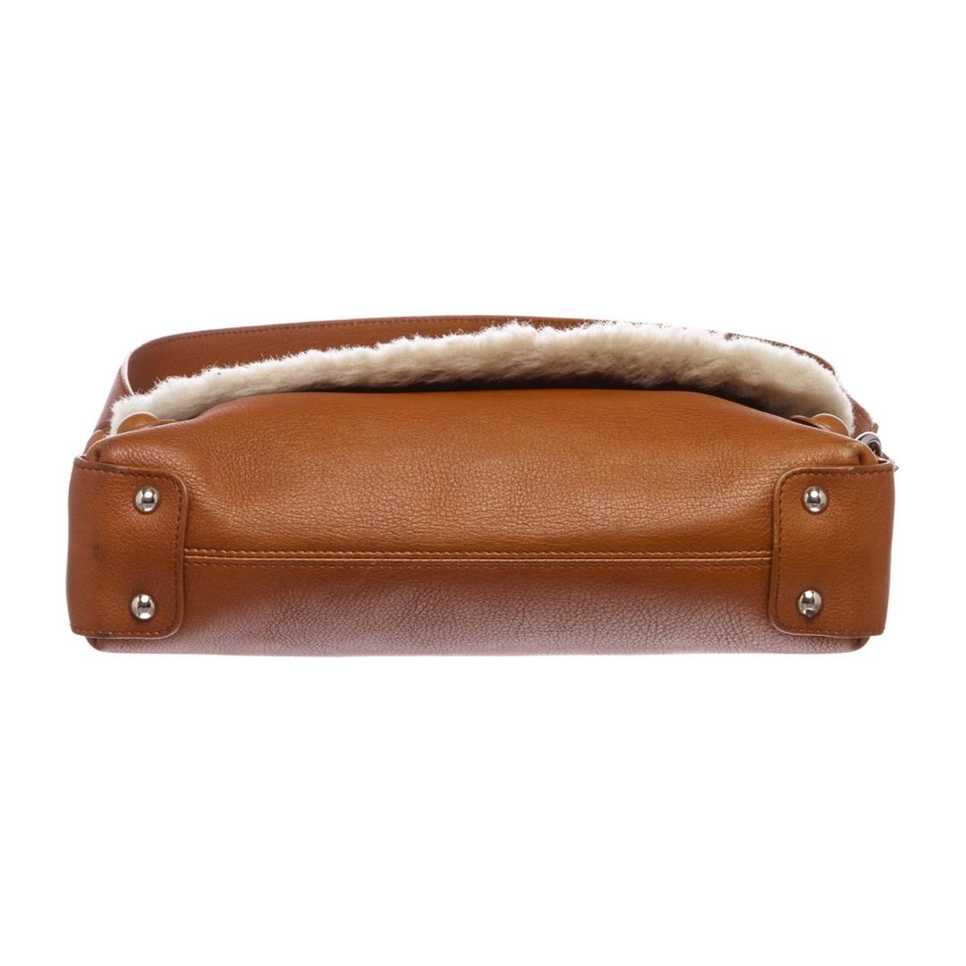 Crafted out of brown leather and beige shearling trim, silver tone hardware, single flat strap, magnetic snap closure. Inner brown fabric lining and side zip pocket.