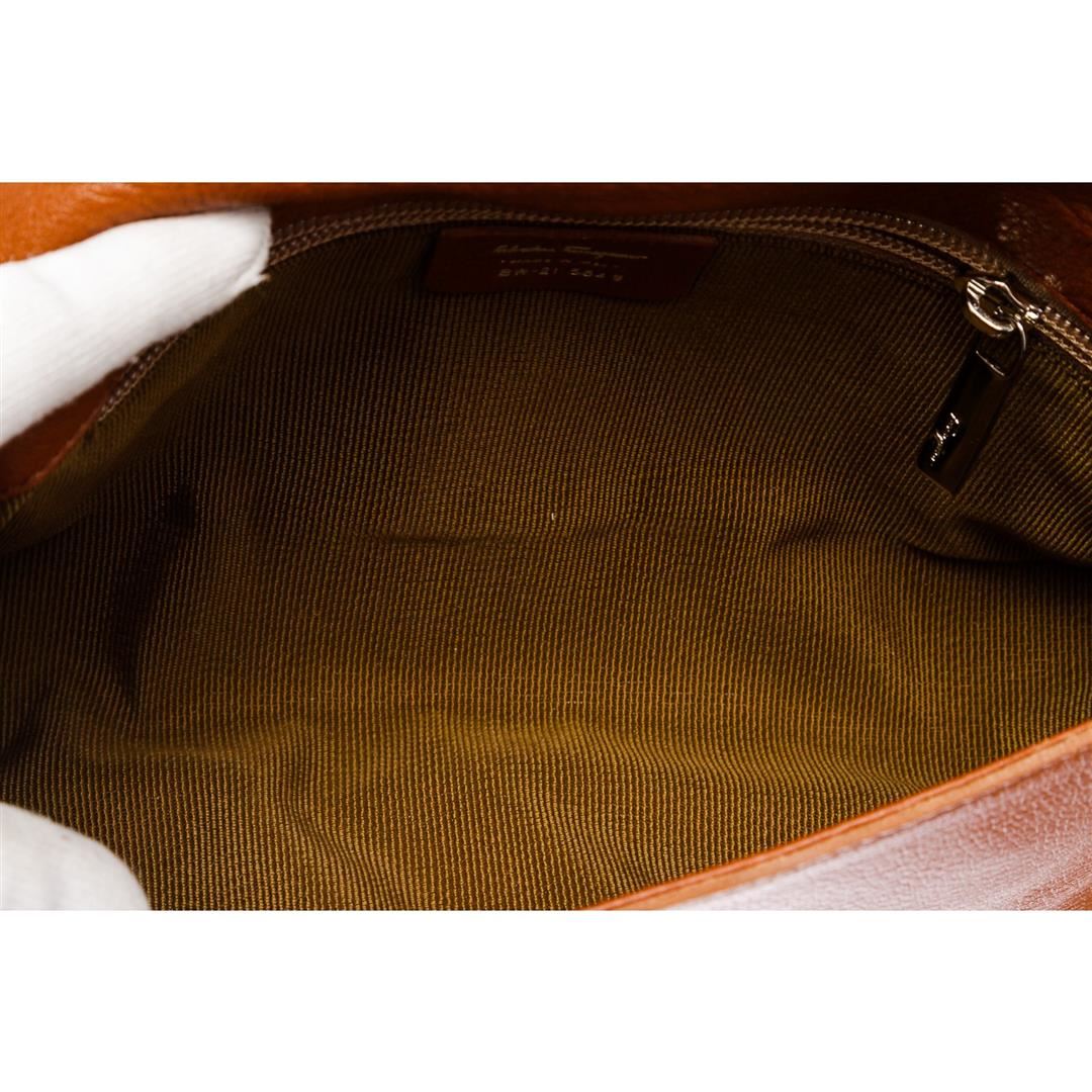 Crafted out of brown leather and beige shearling trim, silver tone hardware, single flat strap, magnetic snap closure. Inner brown fabric lining and side zip pocket.