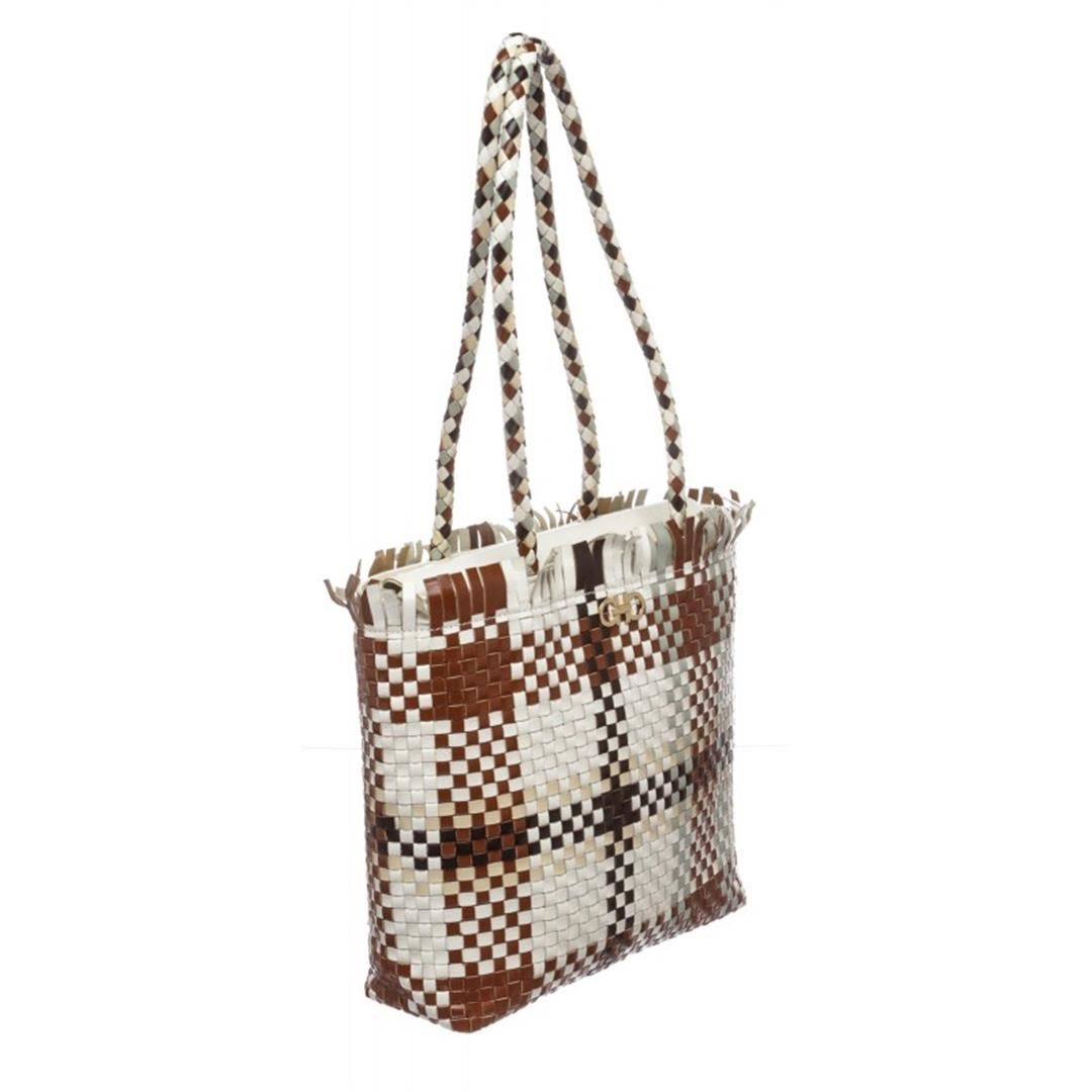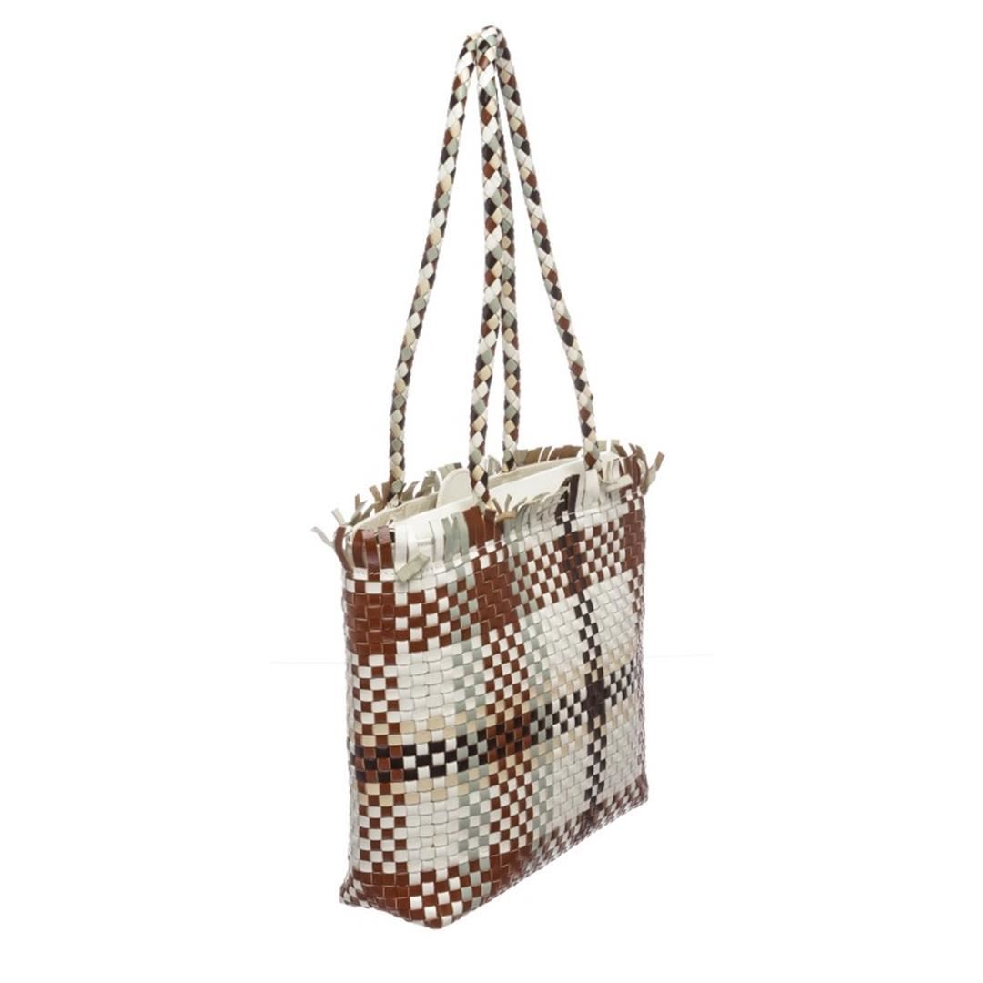 One Salvatore Ferragamo Brown Multicolor Woven Leather Shoulder Handbag. Crafted out of multicolor woven leather, gold tone hardware, dual woven rolled handles, magnetic snap closure. Inner black fabric lining and sideip pocket. Item is pre-owned.