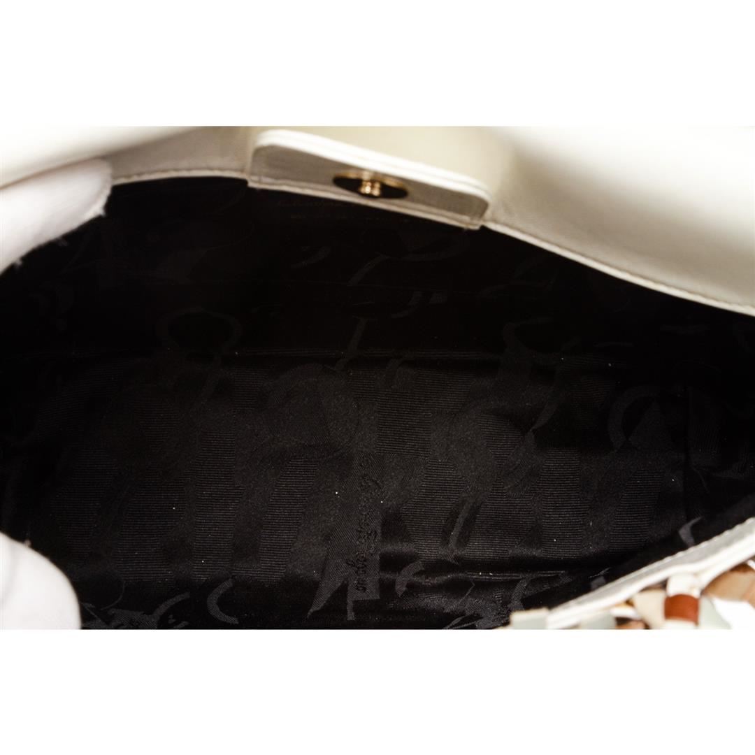 Crafted out of multicolor woven leather, gold tone hardware, dual woven rolled handles, magnetic snap closure. Inner black fabric lining and side slip pocket.