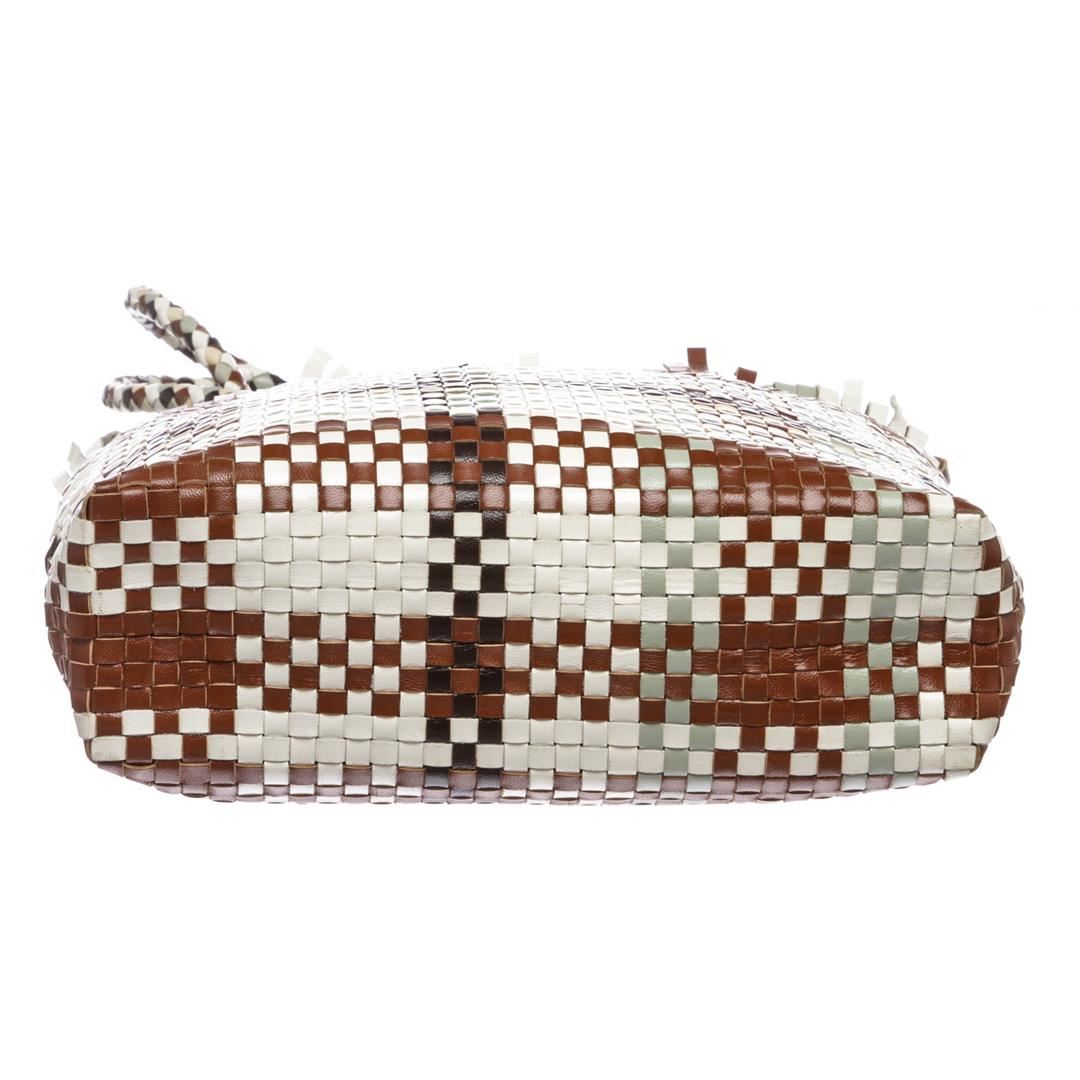 Crafted out of multicolor woven leather, gold tone hardware, dual woven rolled handles, magnetic snap closure. Inner black fabric lining and side slip pocket.