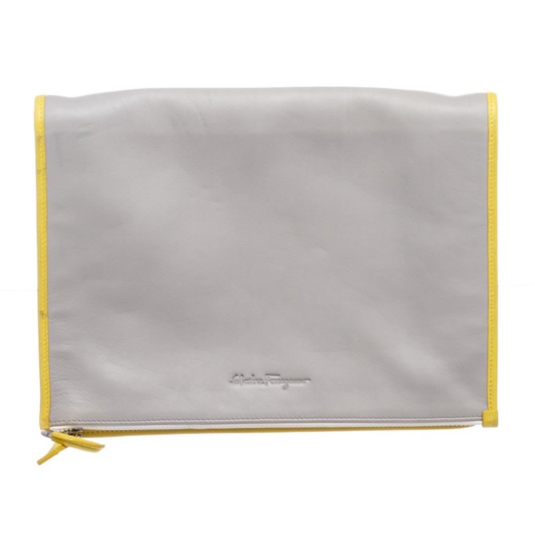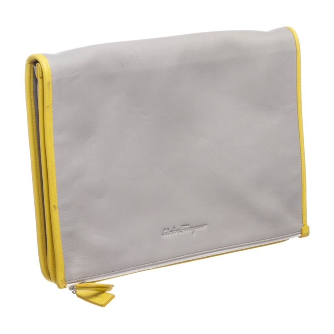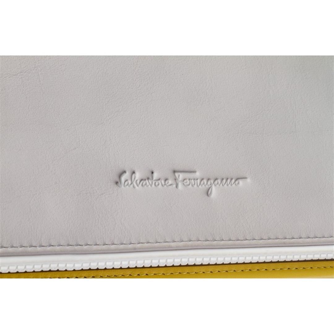 One Salvatore Ferragamo Gray Multicolor Leather Document Holder. Crafted out of gray leather with yellow trim, white zip closure pocket, and silver-tone hardware. Inner magnetic snap closure flap, zip pocket divider, and blue fabric lining. Item is pre-owned.