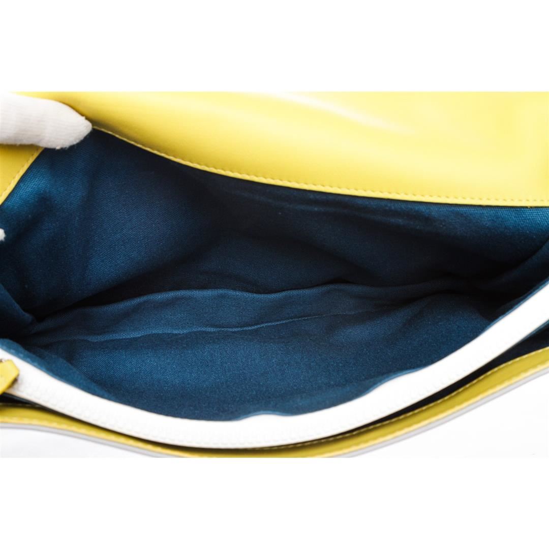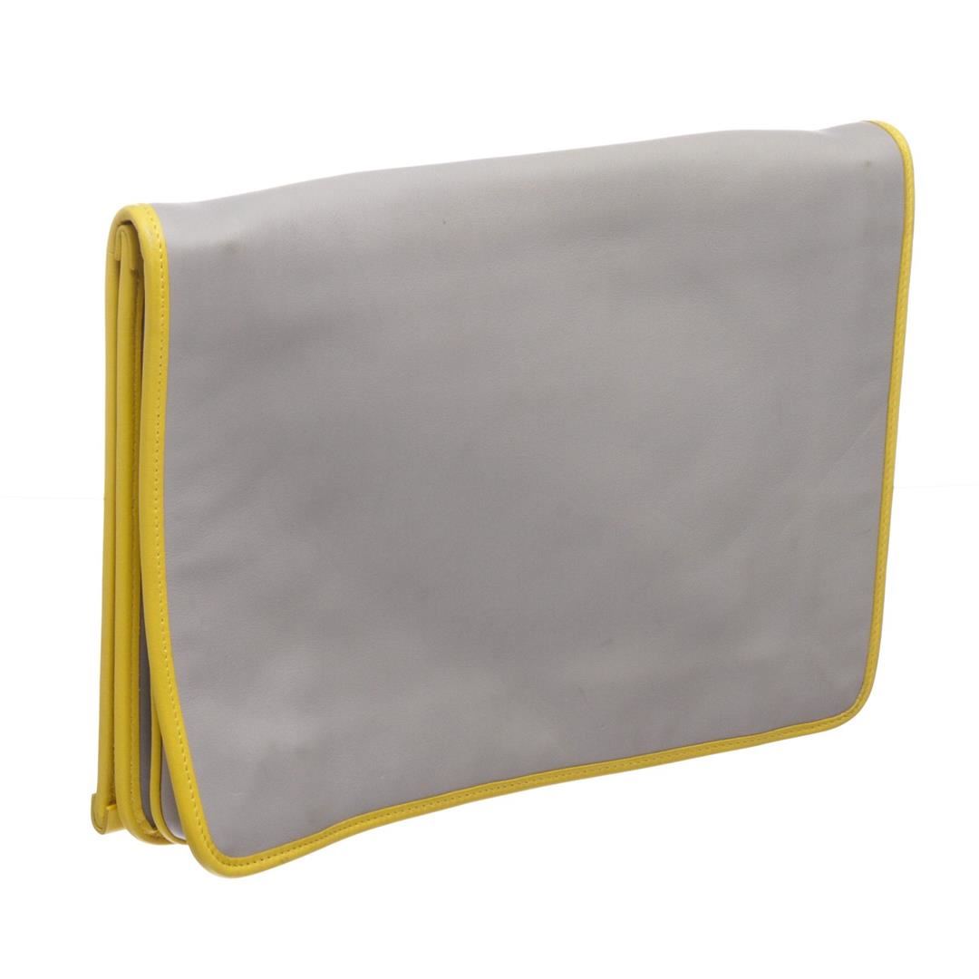 Crafted out of gray leather with yellow trim, white zip closure pocket, and silver-tone hardware. Inner magnetic snap closure flap, zip pocket divider, and blue fabric lining. Authentic.