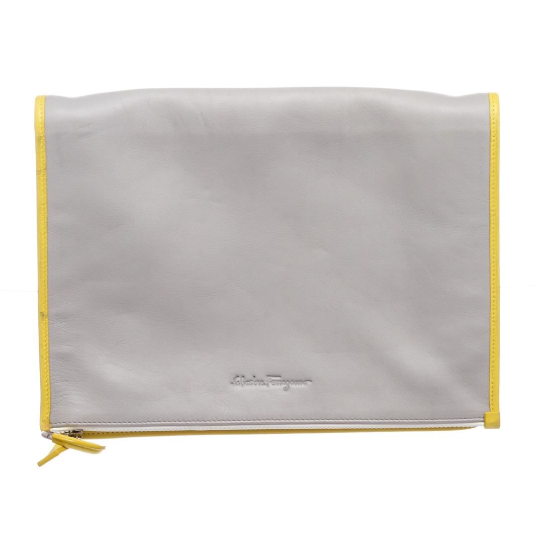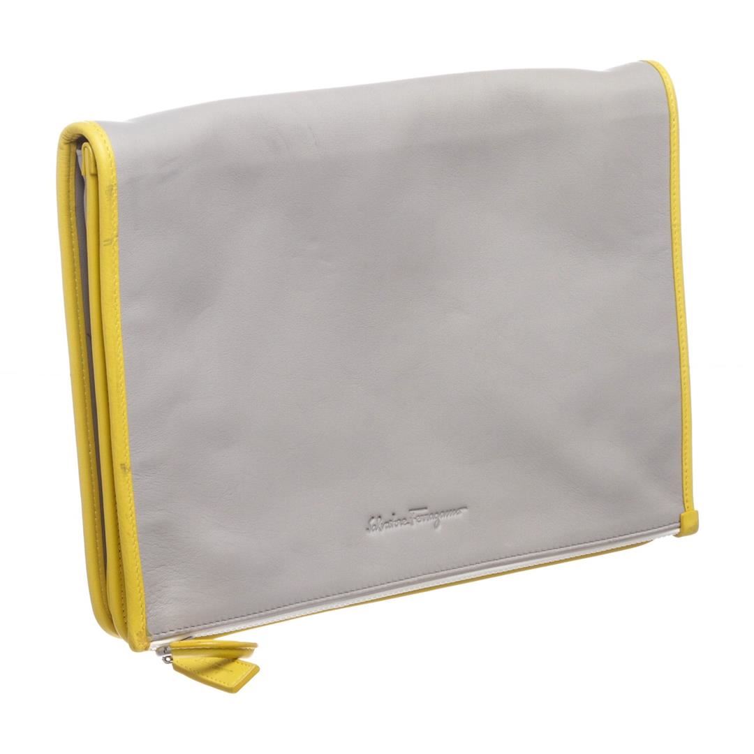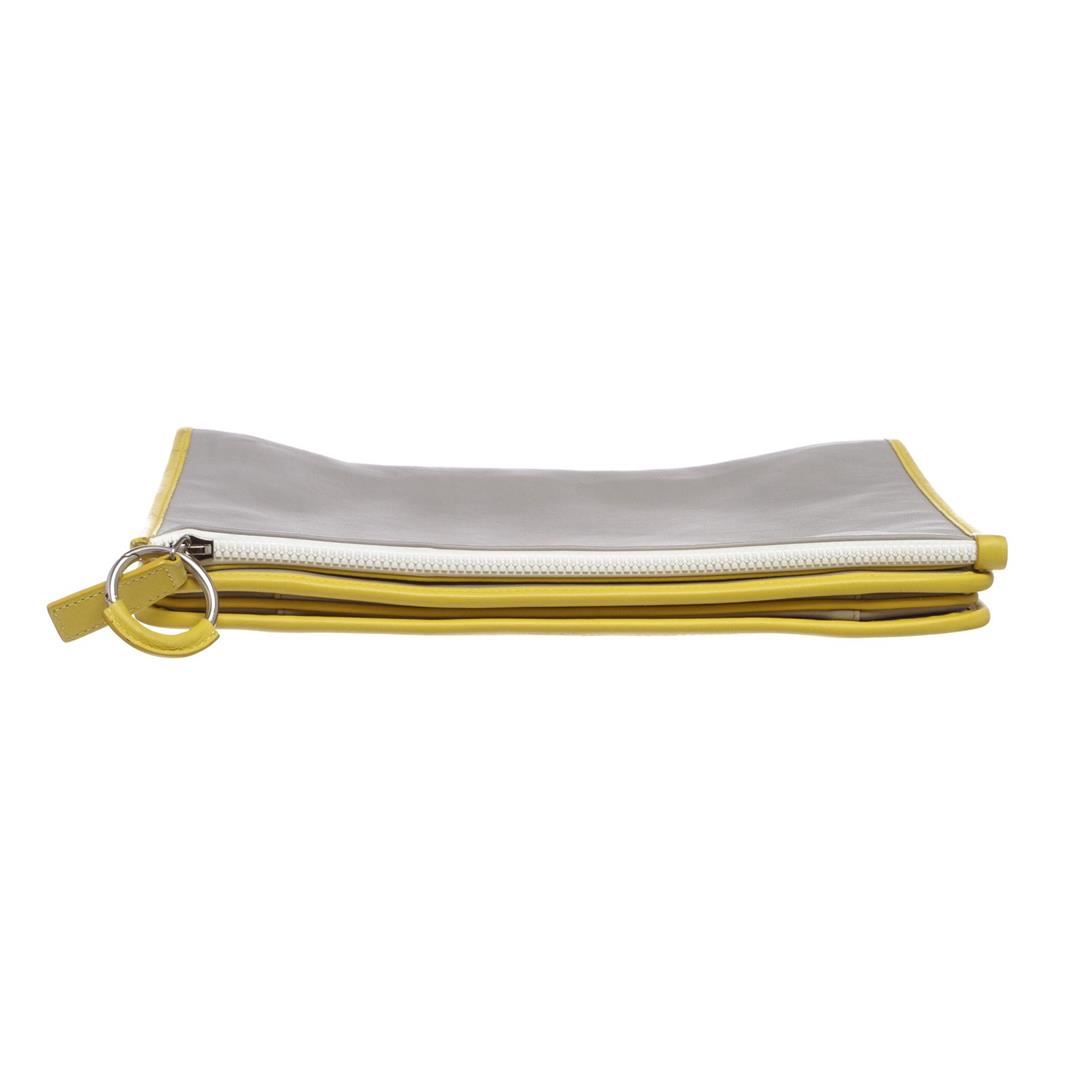 Crafted out of gray leather with yellow trim, white zip closure pocket, and silver-tone hardware. Inner magnetic snap closure flap, zip pocket divider, and blue fabric lining. Authentic.