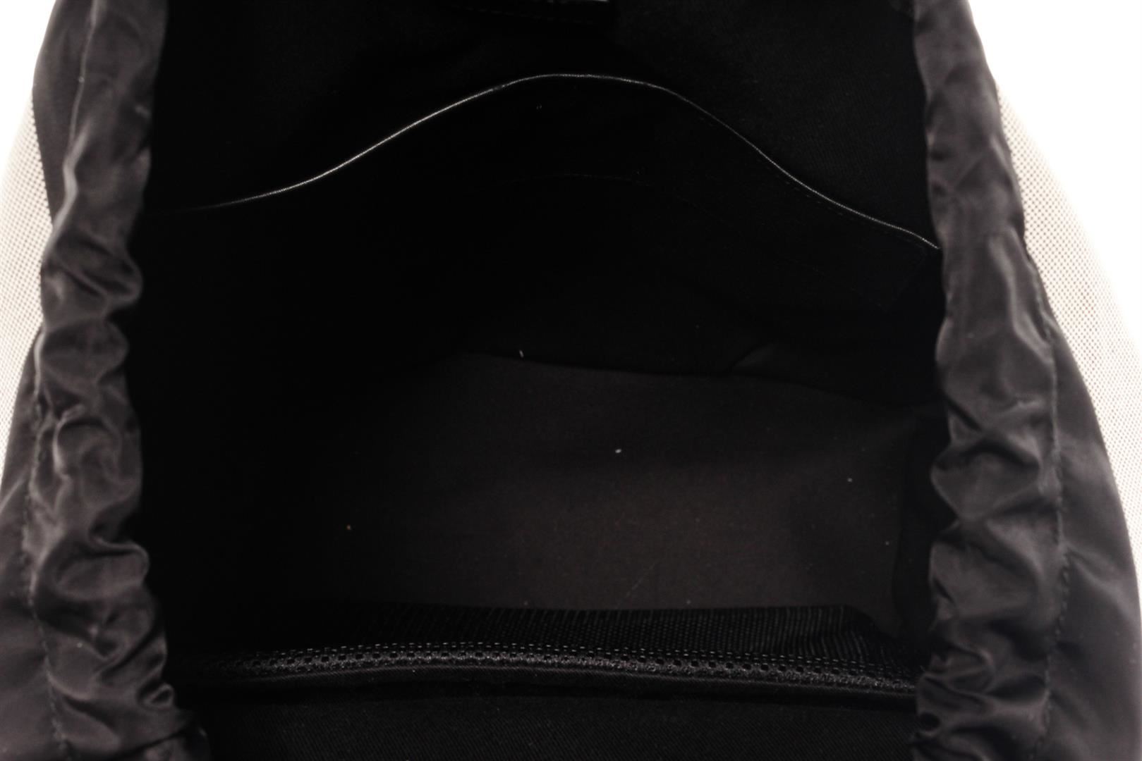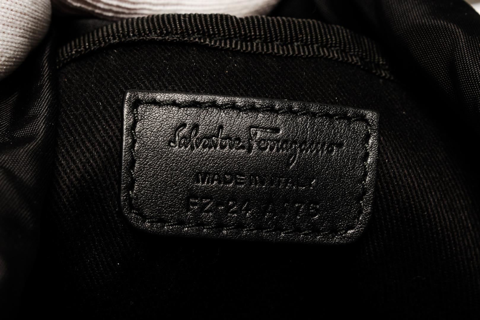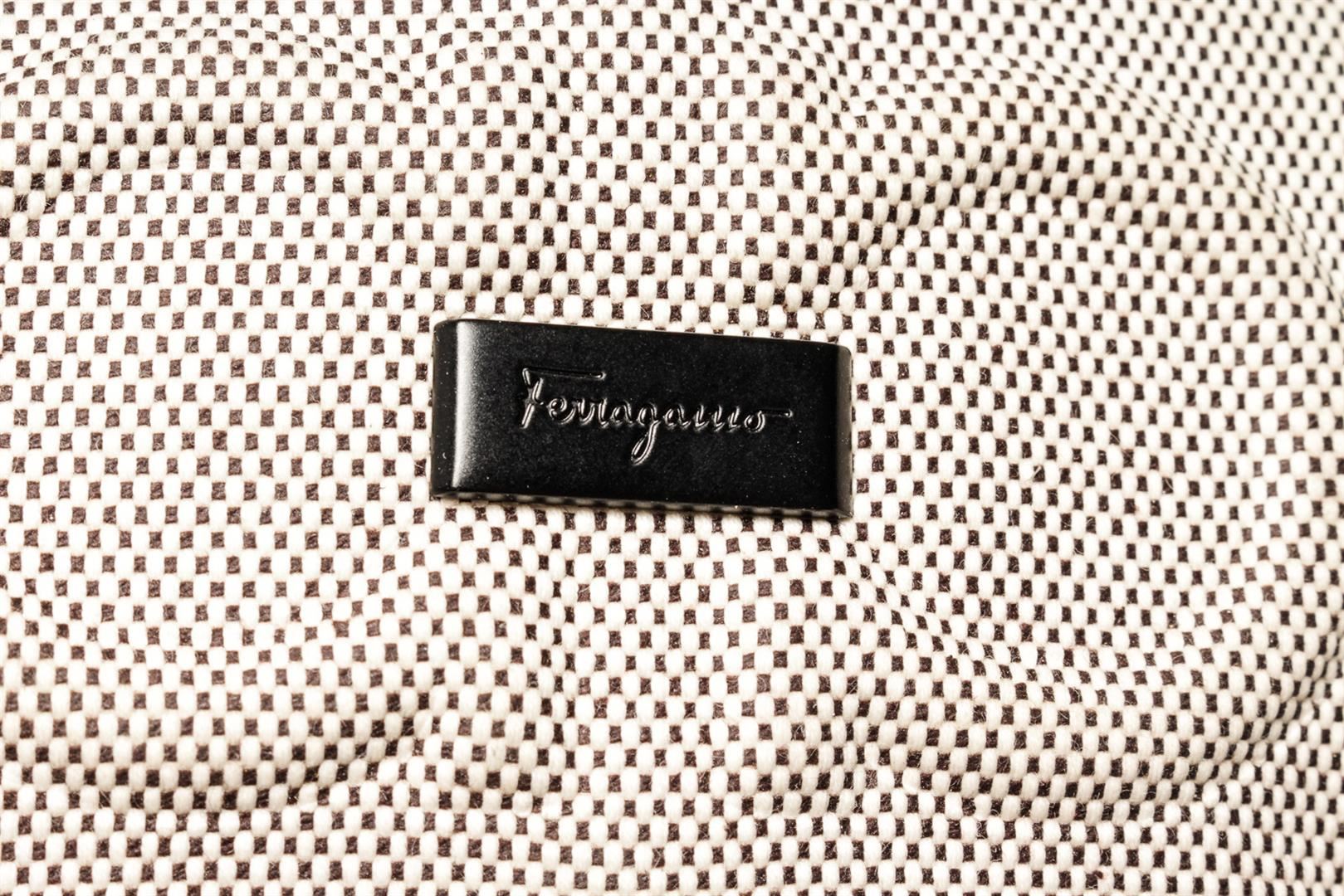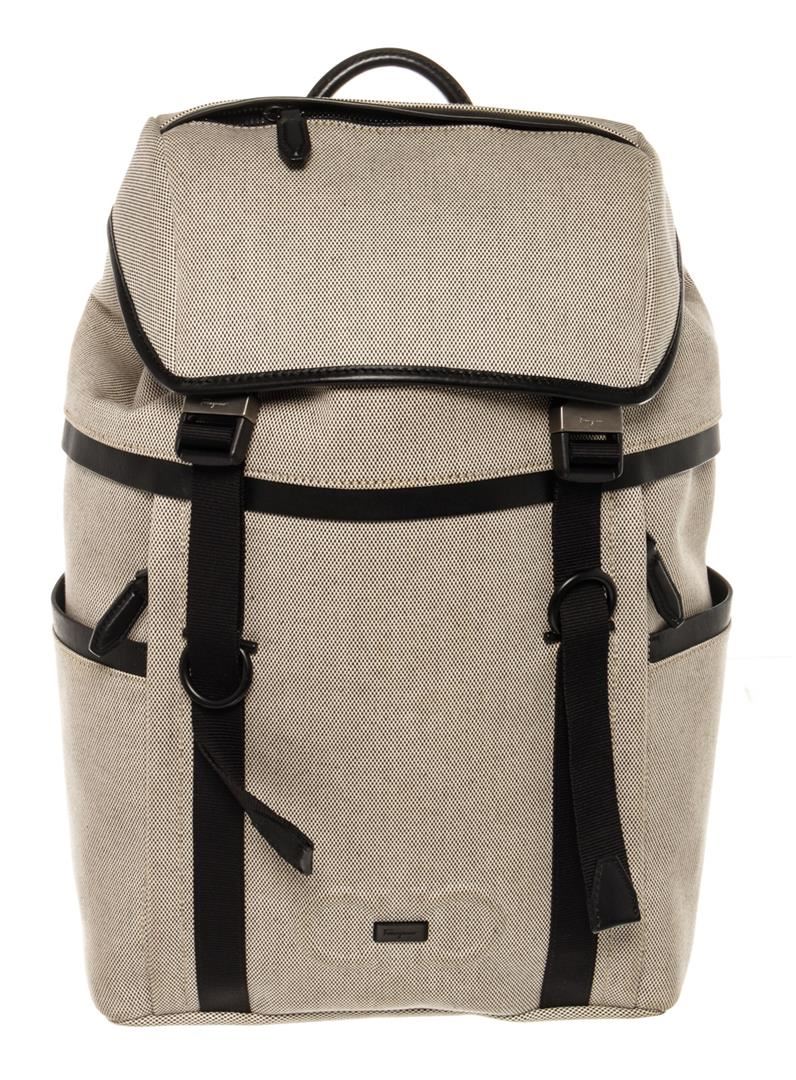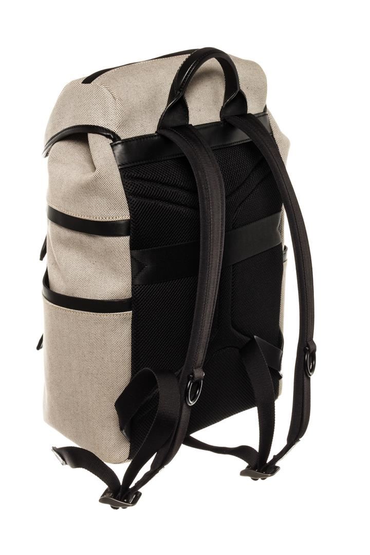 Neutral canvas Salvatore Ferragamo Gancio Double Buckle large backpack with black hardware, black leather trim, single rolled top handle, two exterior pockets, dual canvas shoulder straps, double buckle closure at the front flap, drawstring closure on top