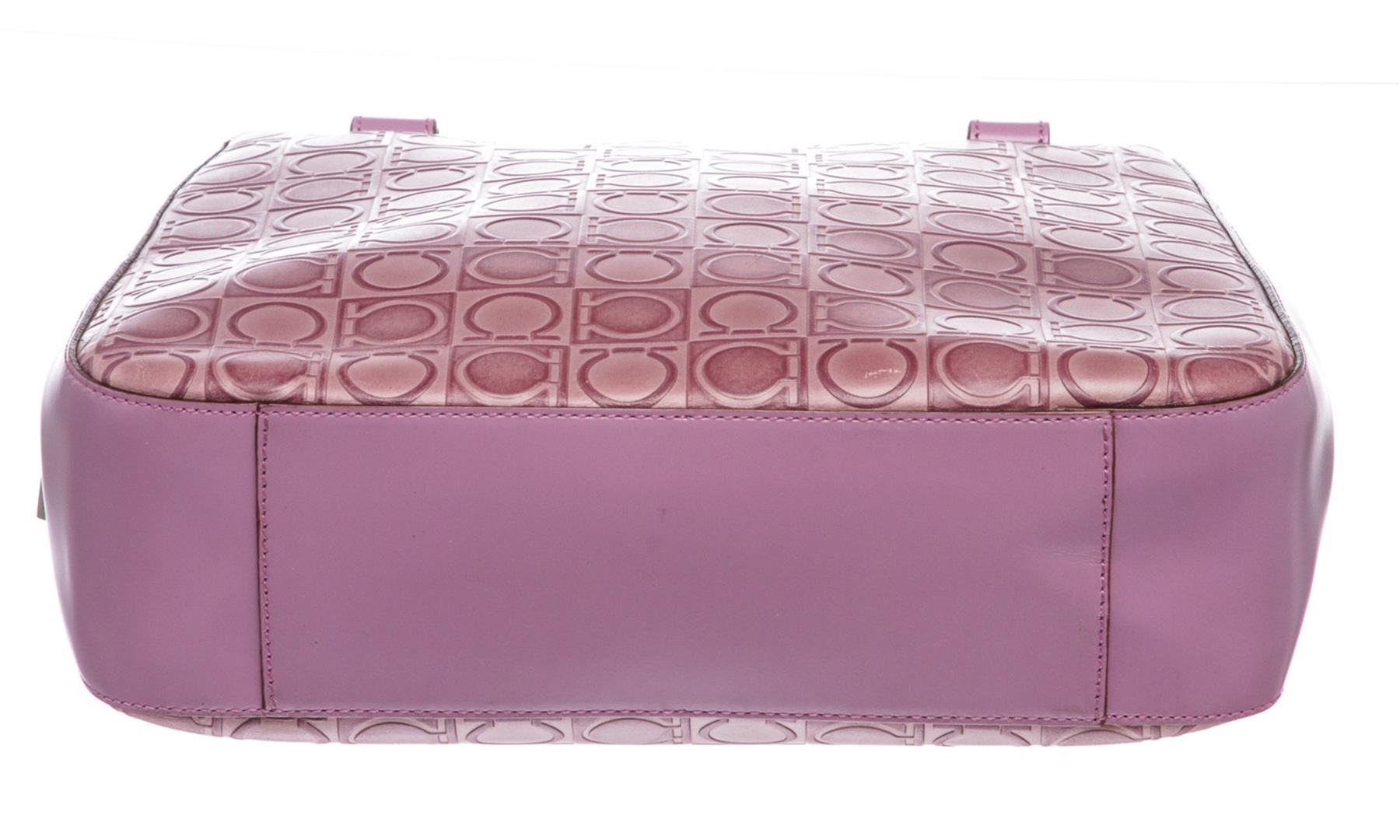 One Salvatore Ferragamo Purple Embossed Leather Shoulder Handbag. Crafted out of purple embossed leather, silver tone hardware, dual rolled shoulder straps. Inner beige fabric lining and side zip pocket.
