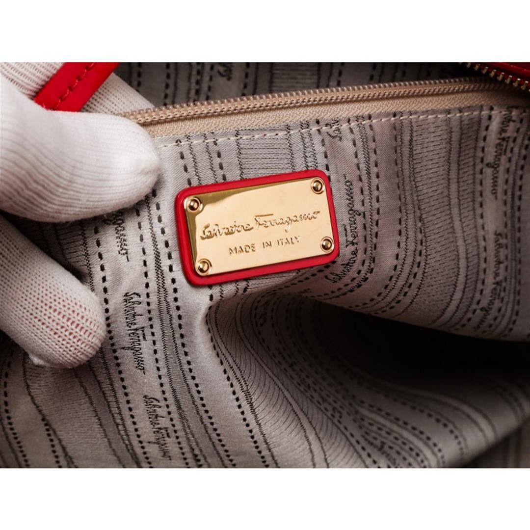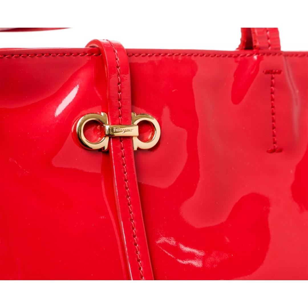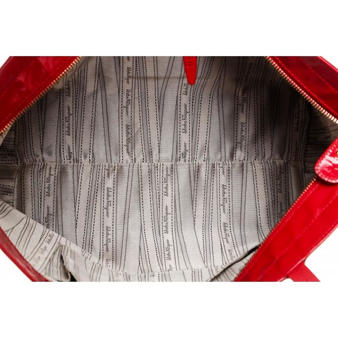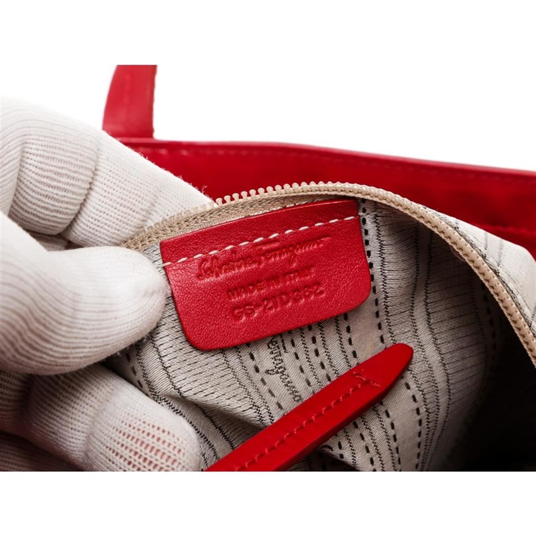 Salvatore Ferragamo Red Vinyl Tote Bag. Overall Zipper Closure with lined interior with side zipper and two sideip pockets. Light dark stain on exterior rear on bag. A versatile tote for everyday use. Item is pre-owned.