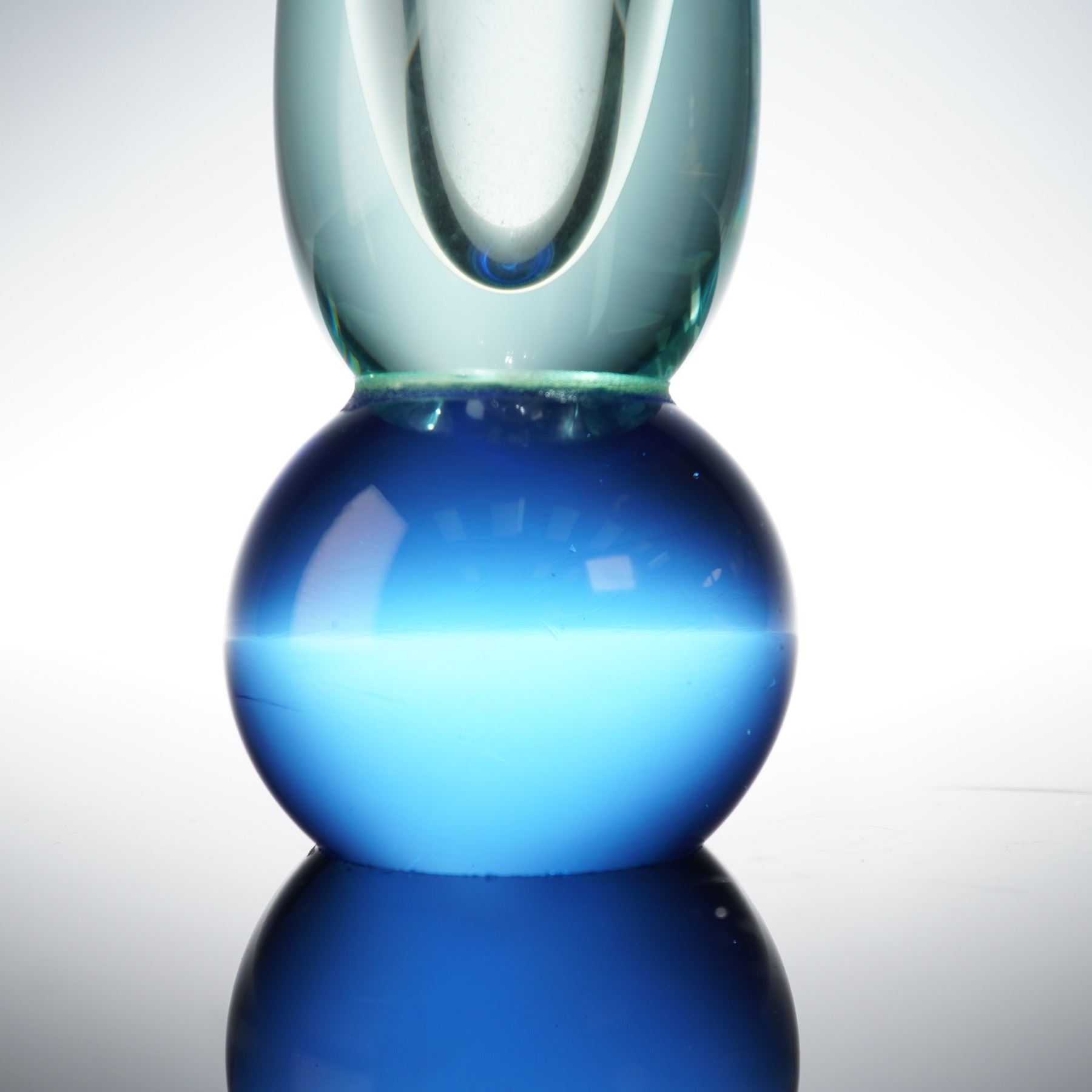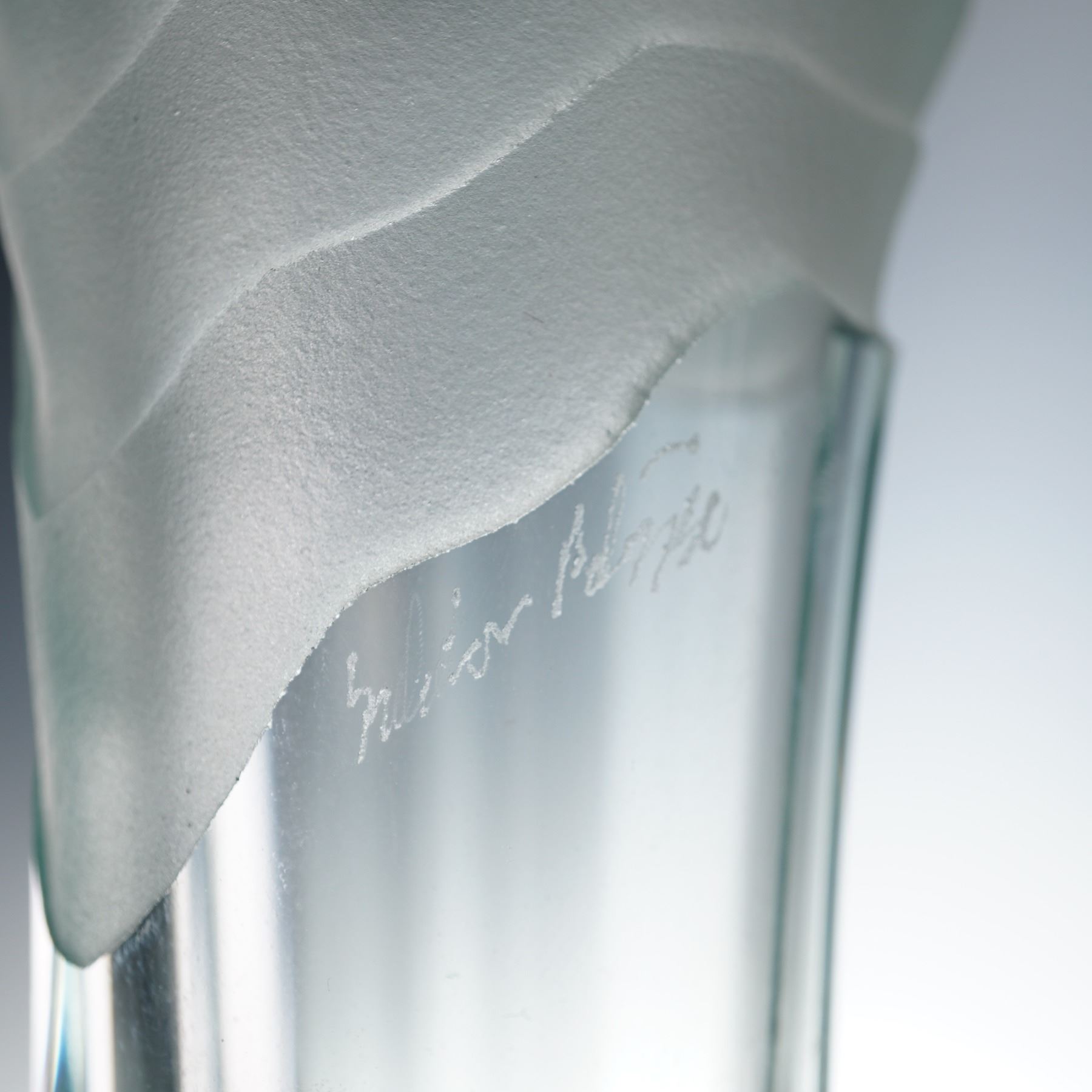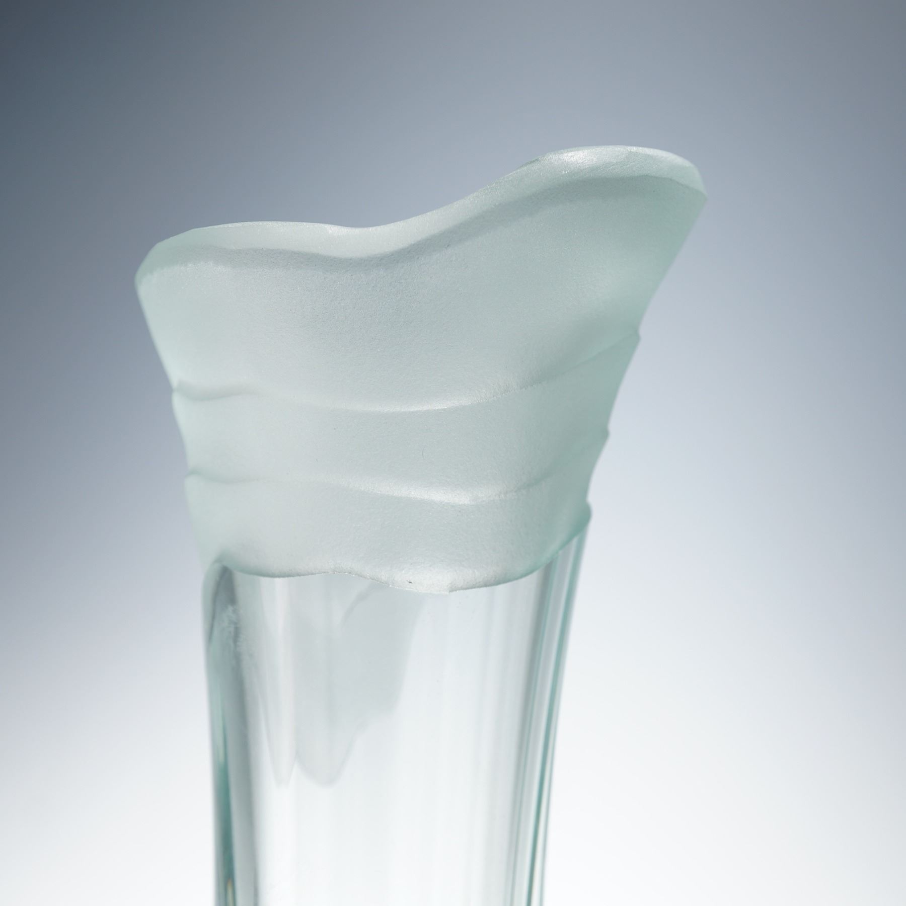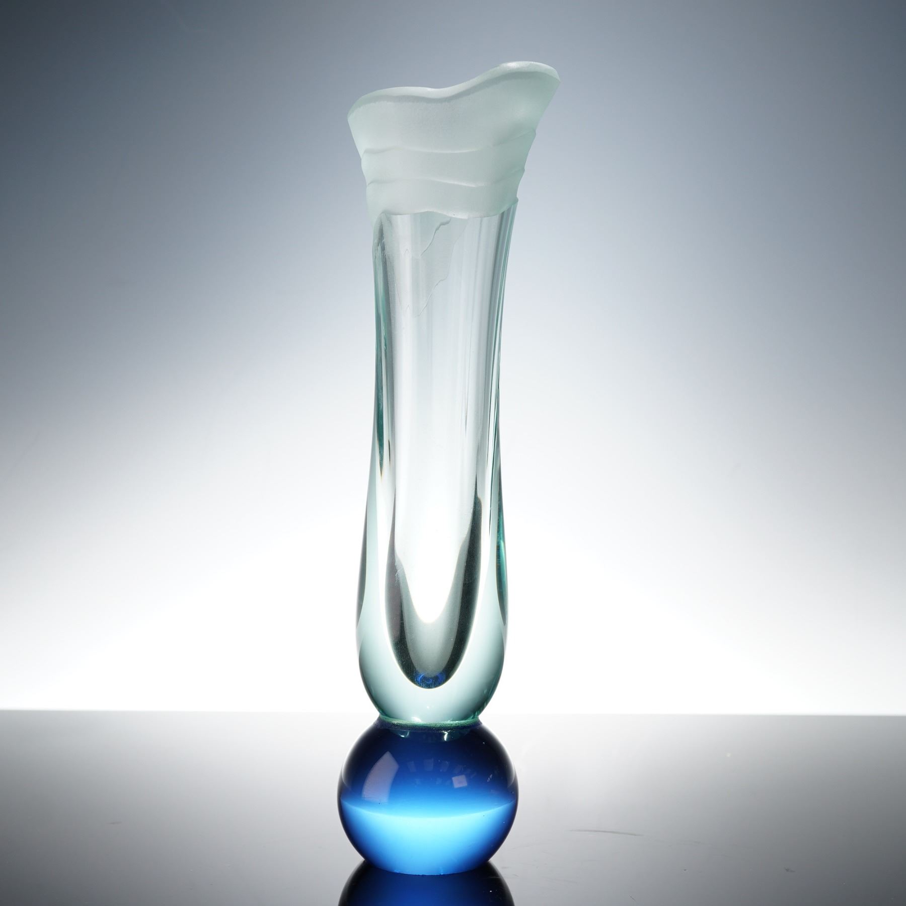 A signed studio art glass vase by Italian artist Salvatore Polizzi. The tall, sculptural form features a frosted, wave-like upper section above a clear columnar body resting on a luminous blue spherical base. Polizzi's refined use of transparency and matte texture creates an elegant interplay of light and form. Signed Salvatore Polizzi near the rim.