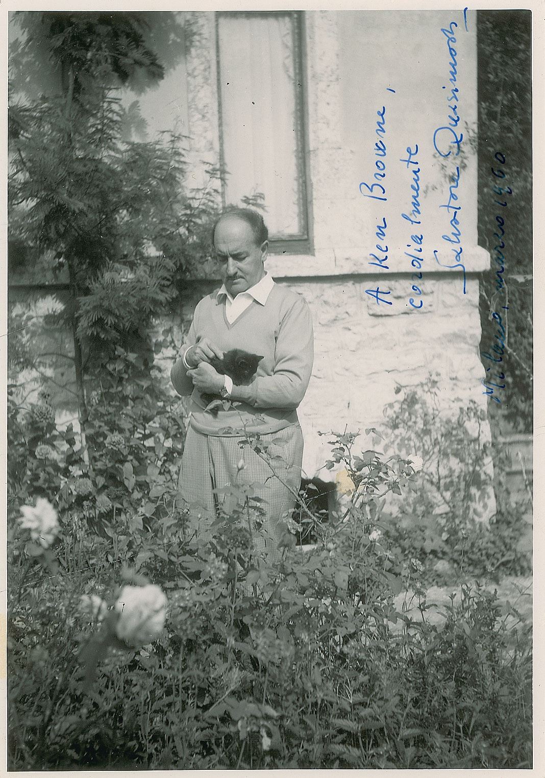 Italian novelist and poet (1901–1968) who received the 1959 Nobel Prize in Literature 'for his lyrical poetry, which with classical fire expresses the tragic experience of life in our own times.' Vintage glossy 5 x 7 photo of Quasimodo petting a small black cat in a garden, signed and inscribed in blue ink, "A Ken Browne, cordialmente, Salvatore Quasimodo, Milano, Marzo 1960.” In very good to fine condition, with several paperclip impressions and surface impressions to the top edge, and a light diagonal crease which passes across Quasimodo's pants. Accompanied by a personal calling card belonging to Quasimodo.