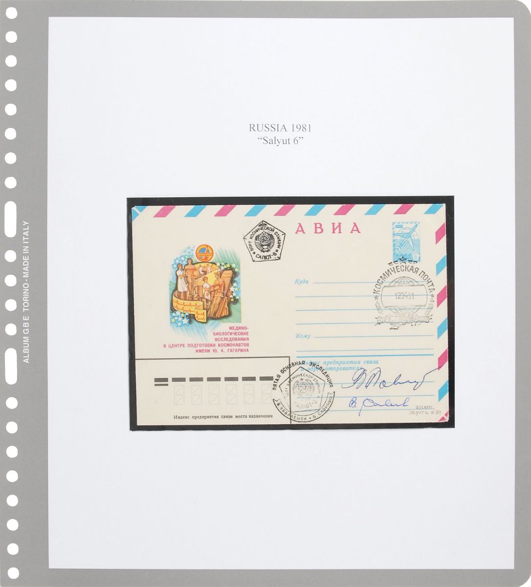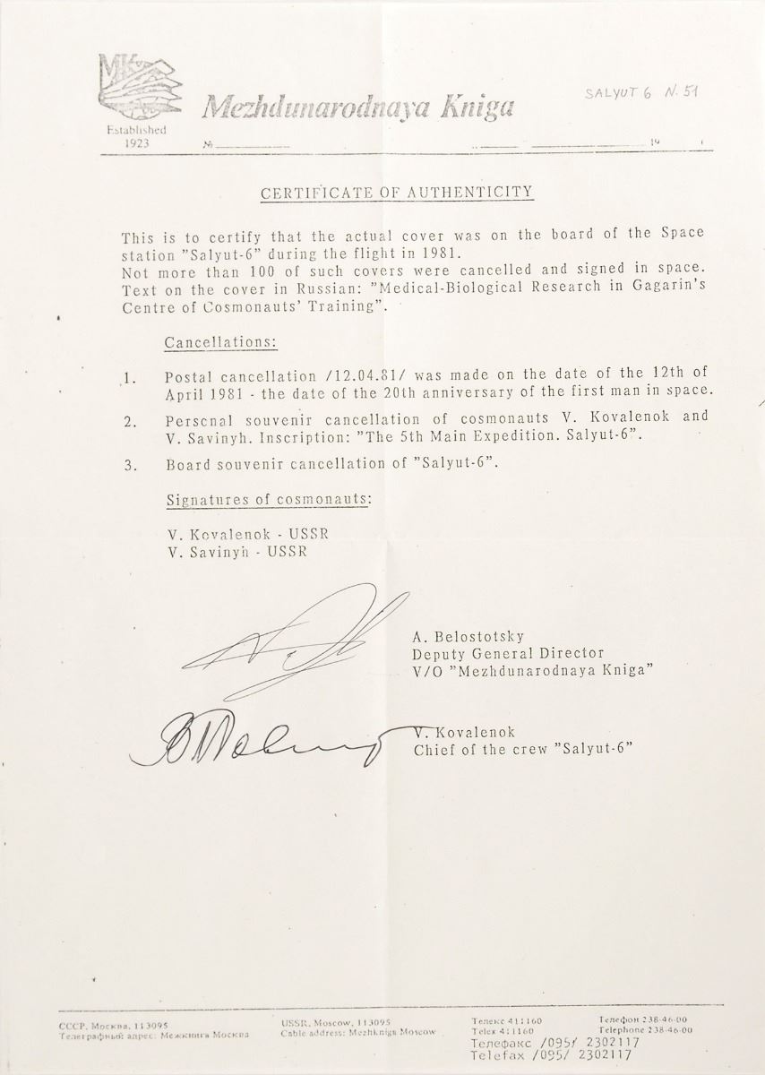 Flown commemorative cover in Cyrillic carried on board the Salyut 6 space station by the crew of Soyuz T-4, 6.25 x 4.5, postmarked April 12, 1981, signed below in blue ballpoint by Vladimir Kovalyonok and Viktor Savinykh. In fine condition. Accompanied by a Bolaffi folder and a certificate of authenticity from Kniga signed by Kovalyonok.