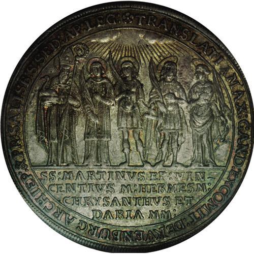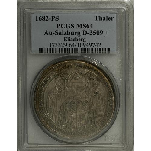 <B>Salzburg. Maximilian Gandolph Taler 1682-PS, </B></I>KM233, Davenport 3509, MS64 PCGS Eliasberg, a superb coin with light gray and gold patina and beautiful details. Struck to commemorate the 1100th year of the Bishopric.<BR><I>From the Louis E. Eliasberg, Sr. Collection</B></I><BR><BR><b>Shipping:</b> Coin/Currency (<a target="_blank" href="http://www.heritageauctions.com/common/shipping.php">view shipping information</a>)