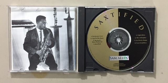 Sam Allen CD, titled "Saxtified", autographed by Sam Allen. Jewel case has cover/booklet of album information, as well as the back cover with song listings.