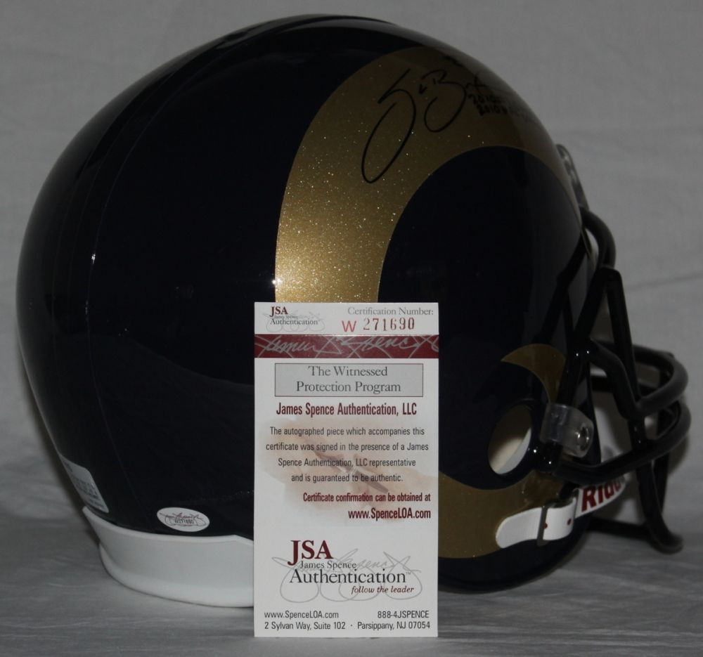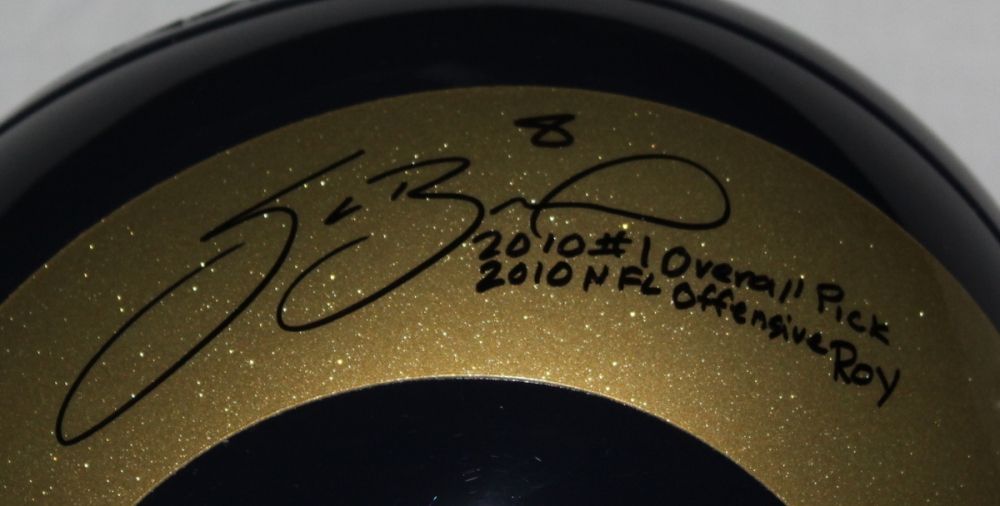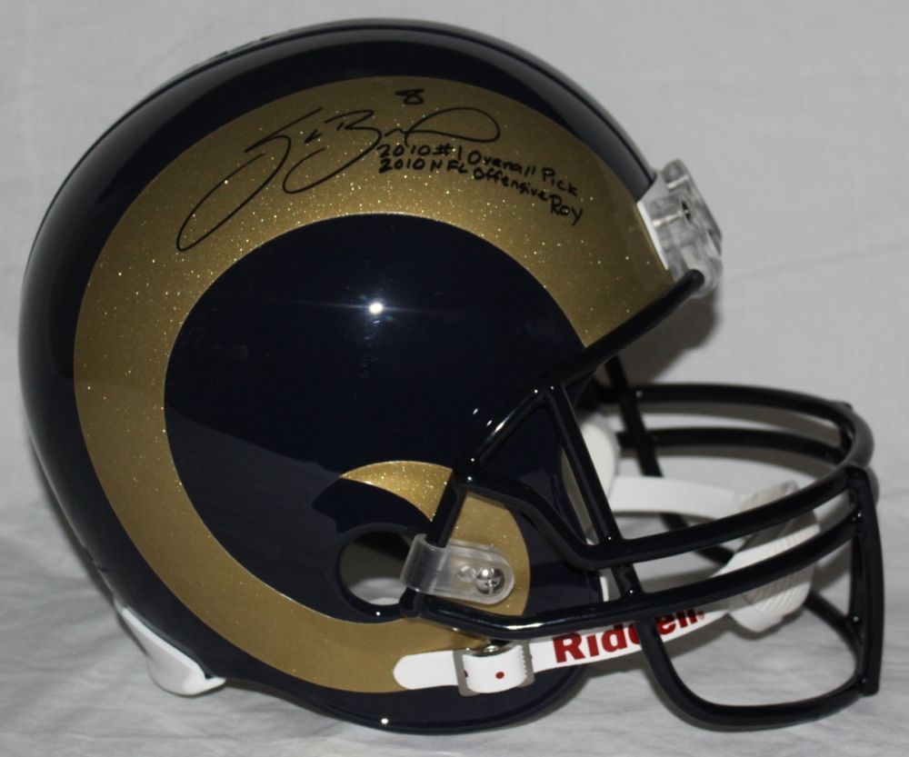 Full-Size Riddell Rams replica helmet. Hand-signed in black felt tip pen by Sam Bradford (inscribed "2010 #1 Overall Pick", "2010 NFL Offensive ROY". The autograph will come with a JSA COA for authentication purposes.