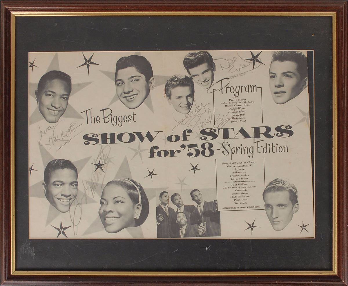 Centerfold page from a program or magazine advertising The Biggest Show of Stars for ’58—Spring Edition, 17.5 x 11.5, signed in ballpoint by Sam Cooke and Phil Everly, and in pencil by Clyde McPhatter and Don Everly. Matted and framed. In fine condition.