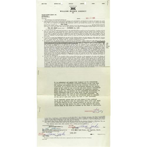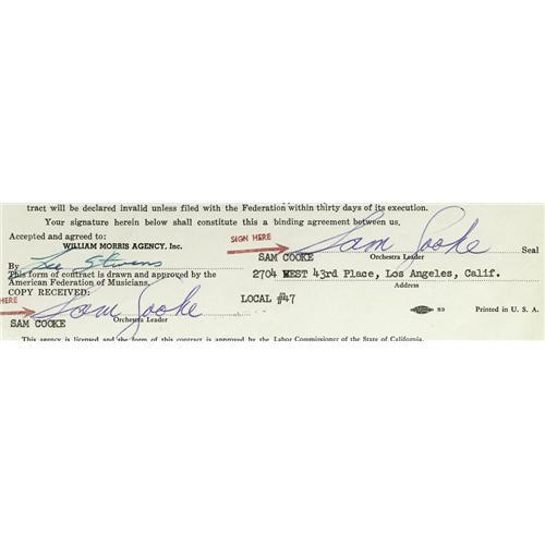 <B>Sam Cooke Signed Contract.</B></I> Smooth Soulster Sam Cooke played a leading role in shaping the music scene with songs like "Chain Gang" and "A Change is Gonna Come," and was poised for superstardom when he died under mysterious circumstances during a confrontation at a seedy L.A. motel. Featured is a one-page document with rider, dated November 18, 1960 signed twice by Cooke in blue ink. In Good condition with the usual staple and binder holes, a horizontal fold crease, and only very faint discoloration. <I>With COA from PSA/DNA.</B></I>
