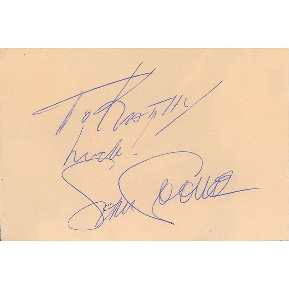 Two items: a ballpoint signature, "Little Richard," on a 2 x 3.25 photo clipped from a magazine and affixed to a same-size mount; and a ballpoint signature, "To Kathy, Luck! Sam Cooke," on a peach 5 x 3.25 album page. Both signatures are affixed on opposing pages inside a program for a presentation of The Little Richard Show held in October of 1962. In overall fine condition, with a creased corner tip to the Cooke signature, and slight creasing and wear to the program.