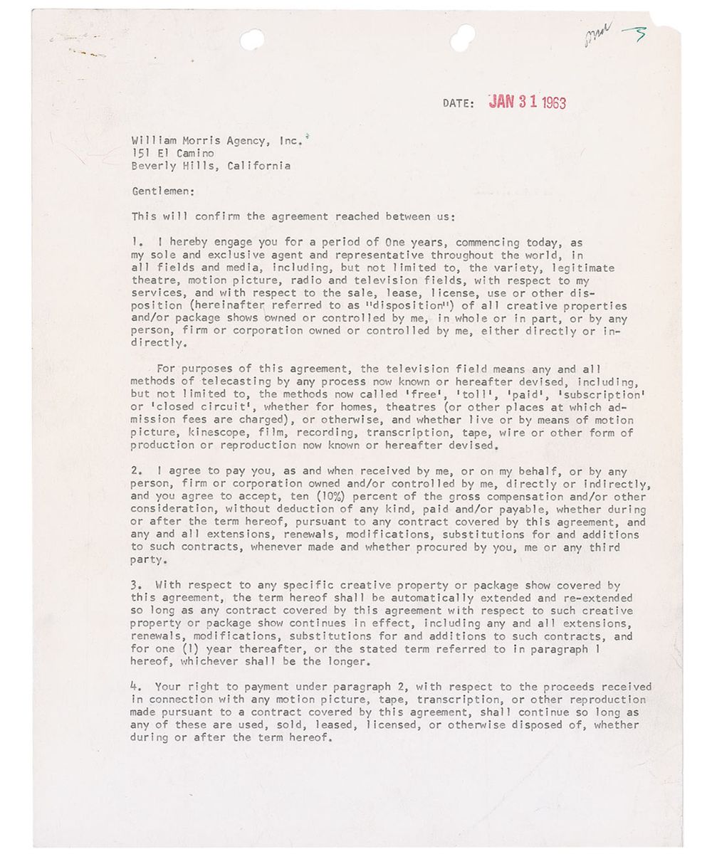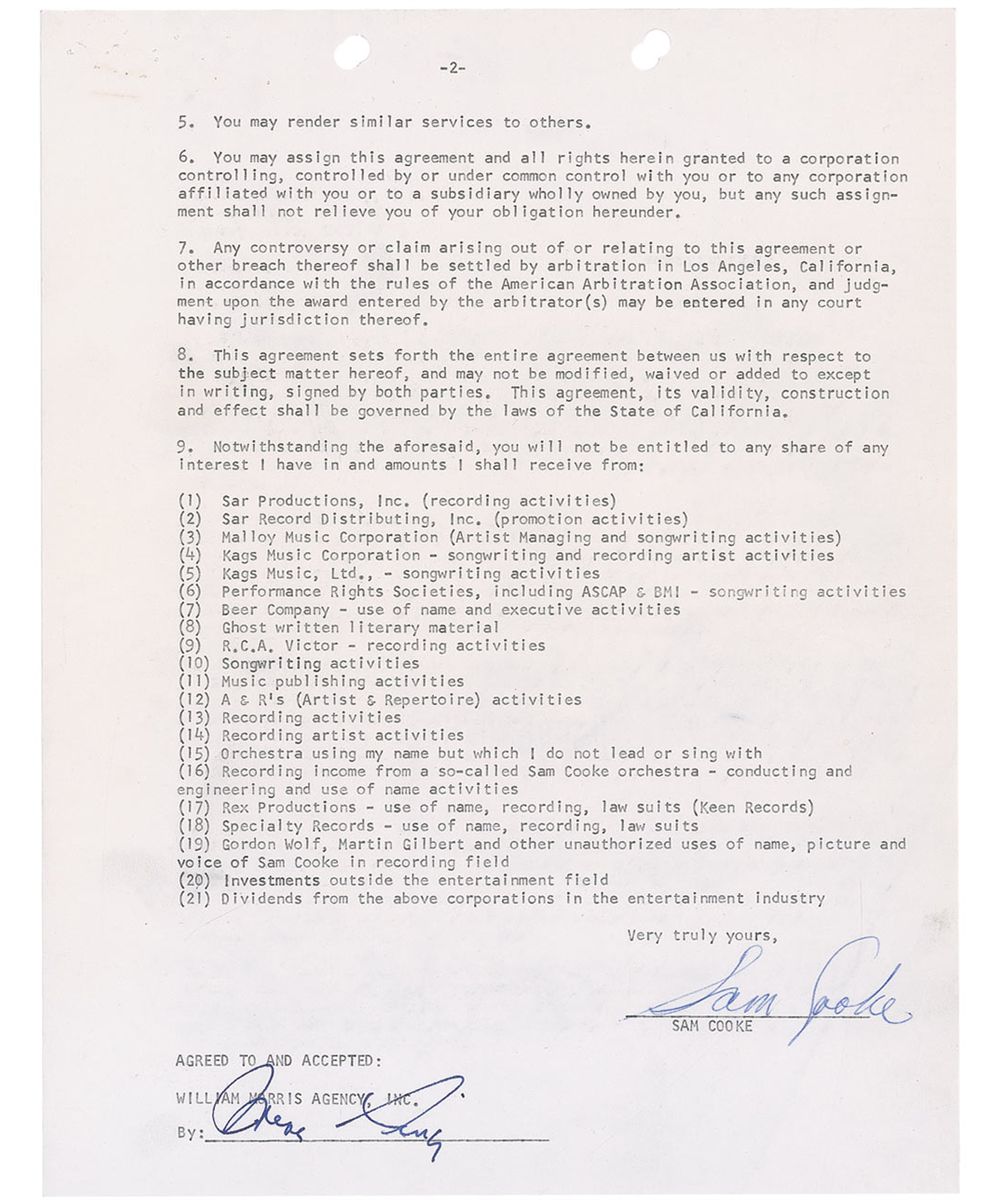 Popular rhythm-and-blues and soul artist (1931–1964) who recorded such hits as ‘You Send Me,’ ‘Cupid,’ and ‘Twistin' the Night Away.’ The 33-year-old singer was shot to death under mysterious circumstances at a Los Angeles hotel on December 11, 1964. DS, two pages, 8.5 x 11, January 31, 1963. Agreement between Cooke and the William Morris Agency for representation for Cooke for a period of one year for a 10% commission. Second page lists 21 interests which William Morris will have no interest in including music publishing, ghost writing, Sar Productions, Inc., and use of Cooke’s name in a beer company. In fine condition, with punch and staple holes to top edge and some scattered creases, including a couple through signature.