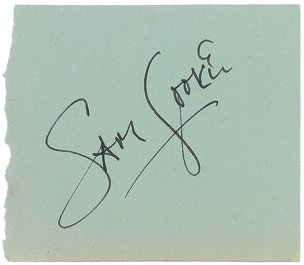 Scarce vintage ink signature, “Sam Cooke,” on an off-white 3 x 2.5 slip. In fine condition. Accompanied by a certificate of authenticity from Roger Epperson/REAL.