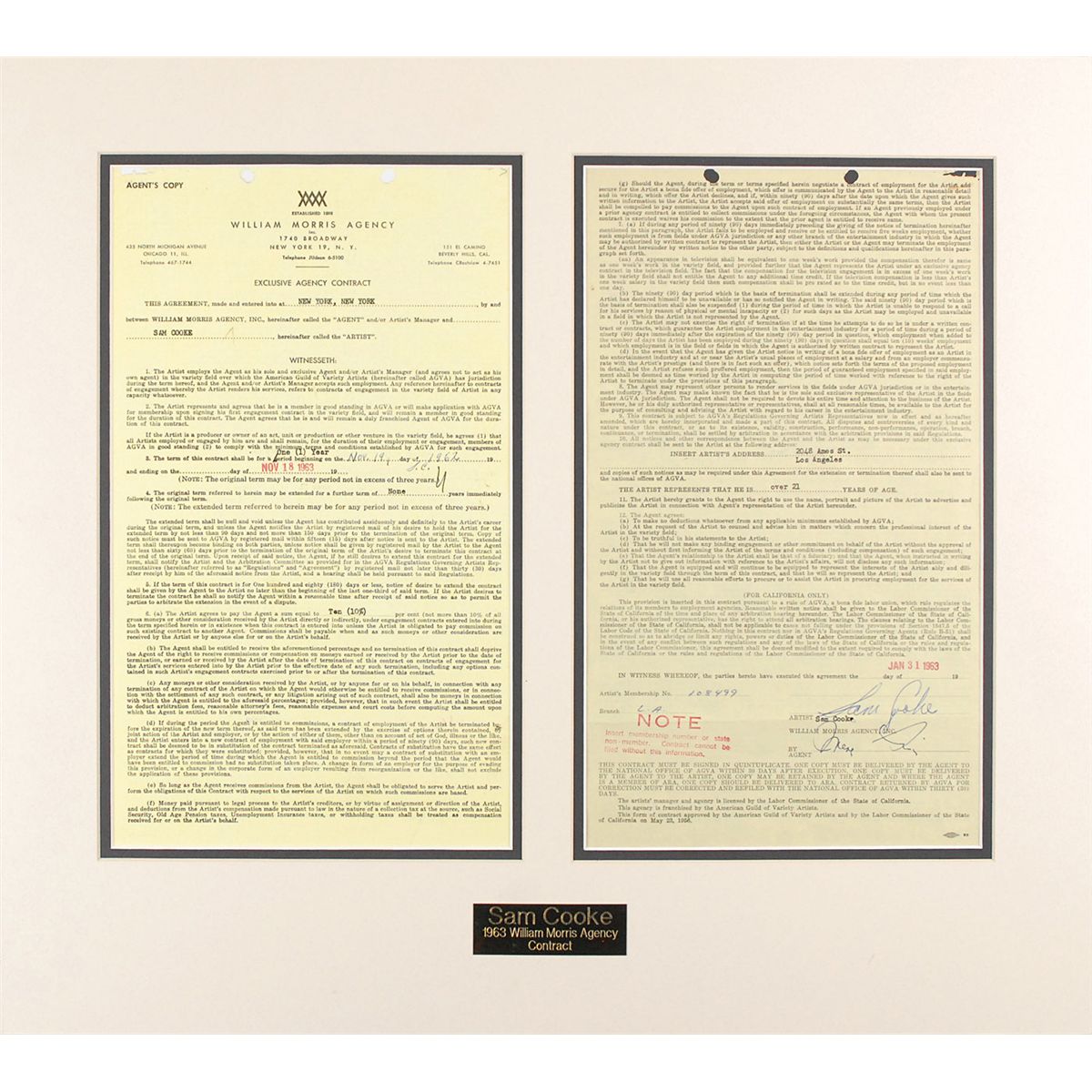 Popular rhythm-and-blues and soul artist (1931–1964) who recorded such hits as ‘You Send Me,’ ‘Cupid,’ and ‘Twistin' the Night Away.’ The 33-year-old singer was shot to death under mysterious circumstances at a Los Angeles hotel on December 11, 1964. DS, one page both sides, 8 x 13, January 31, 1963. Exclusive agency contract between Cooke and the William Morris Agency for a period of one year for the standard 10% commission payable to the agency. Signed on the reverse in blue ballpoint by Cooke, and countersigned by an agency agent. Double-matted with a color copy of the front of the document and a small plaque to an overall size of 21.5 x 19.25. In fine condition, with expected light document wear.