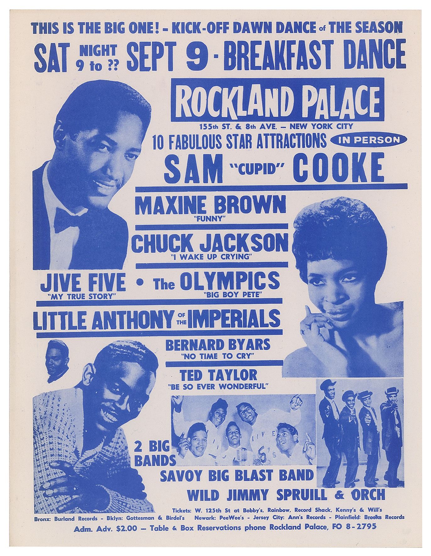 Rare original 8.5 x 11 handbill for a "Breakfast Dance" showcase headlined by Sam Cooke at the Rockland Palace in New York City on September 9, 1961, which features images and song titles of the schedules performers, including: Maxine Brown, Chuck Jackson, the Jive Five, the Olympics, Little Anthony of the Imperials, Bernard Byars, Ted Taylor, the Savoy Big Blast Band, and Wild Jimmy Sprull & Orch. In fine condition.