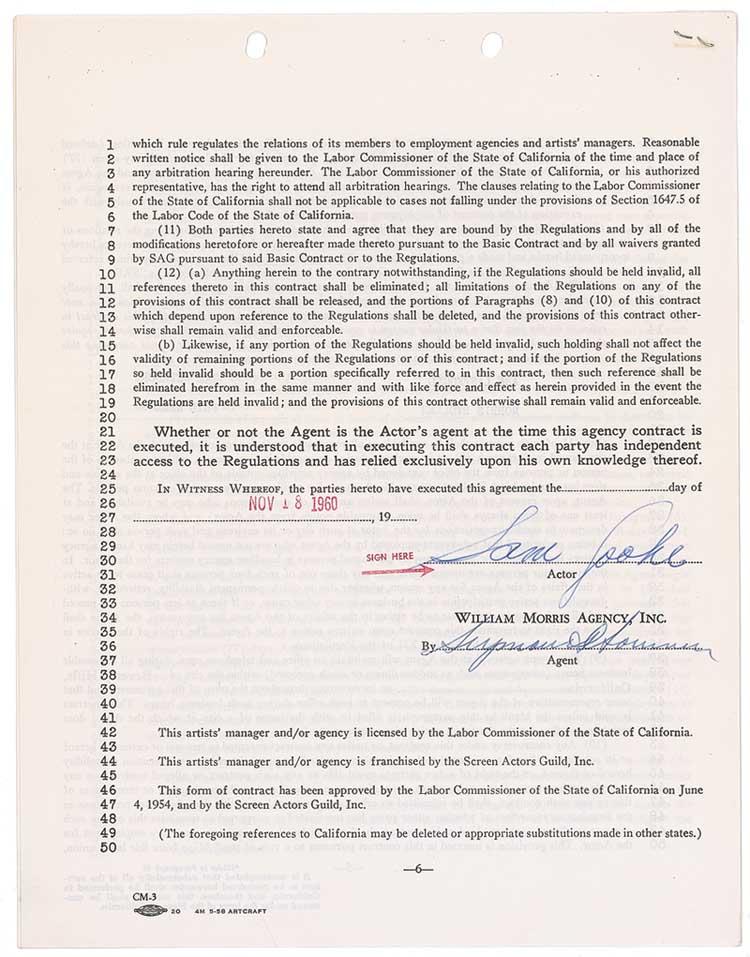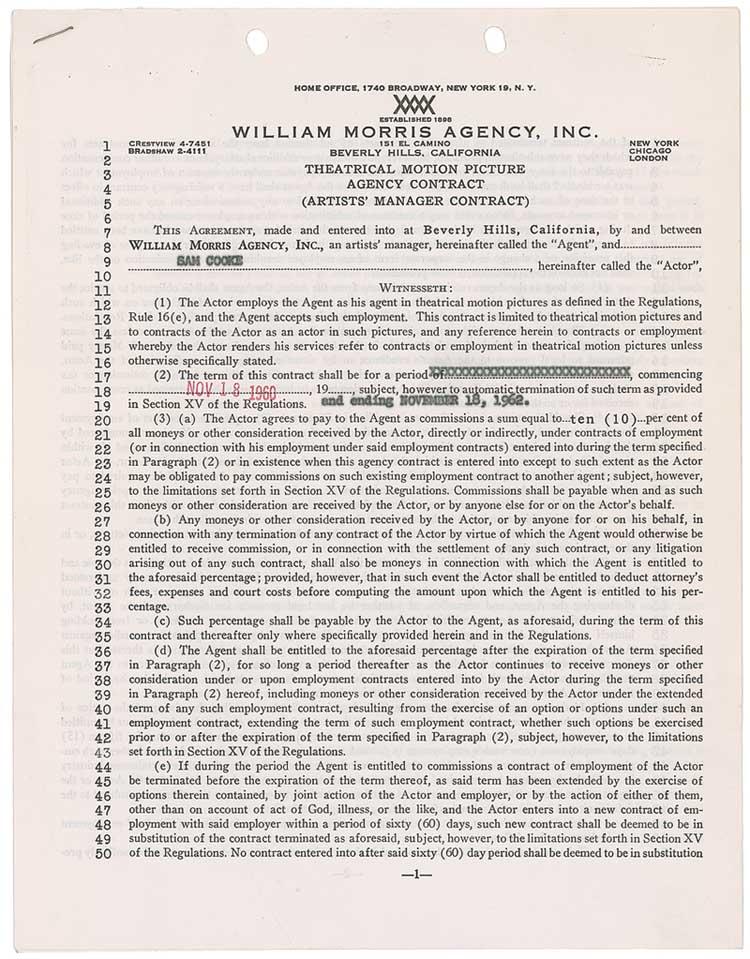 Popular rhythm-and-blues and soul artist (1931–1964) who recorded such hits as “You Send Me,” “Cupid,” and “Twistin' the Night Away.” The 33-year-old singer was shot to death under mysterious circumstances at a Los Angeles hotel on December 11, 1964. Fantastic DS, three pages both sides, 8.5 x 11, William Morris Agency letterhead, November 18, 1960. Standard two year Artists’ Manager contract between Cooke and William Morris, with Cooke agreeing to pay the standard ten percent commission. Crisply signed on the reverse of the last page in blue ballpoint by Cooke. Accompanied by a letter of authenticity from James Spence. In fine condition, with punch and pin holes to top edge. A well-preserved item from a talented young singer who came to a tragic end. Pre-certified PSA/DNA and RRAuction COA.