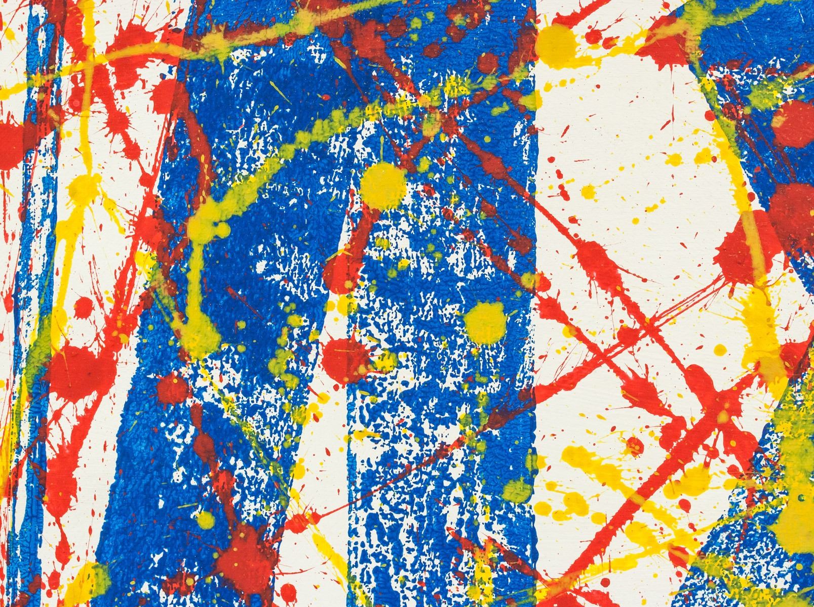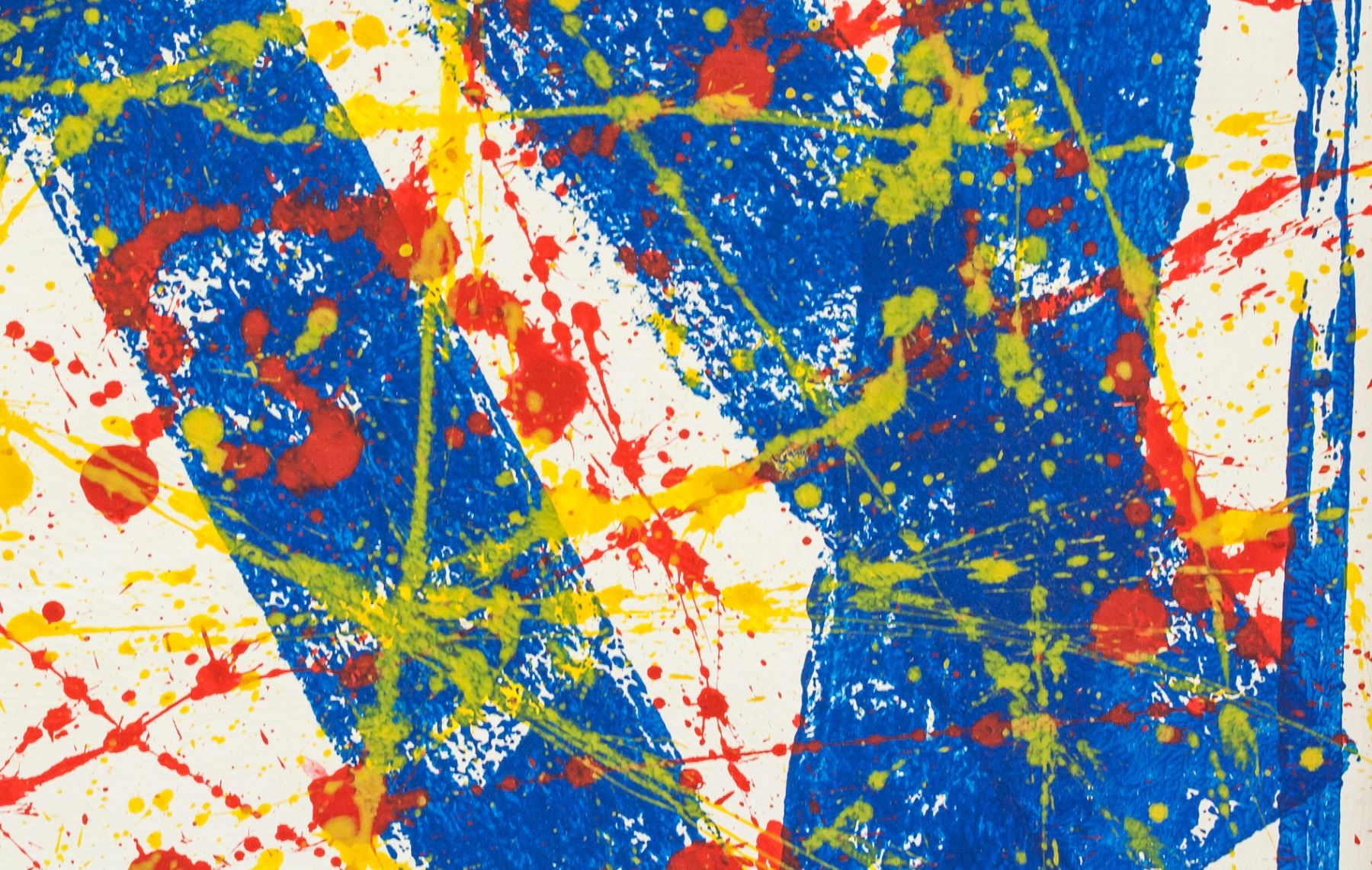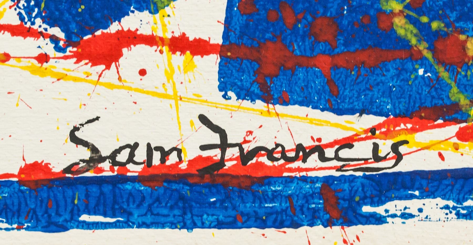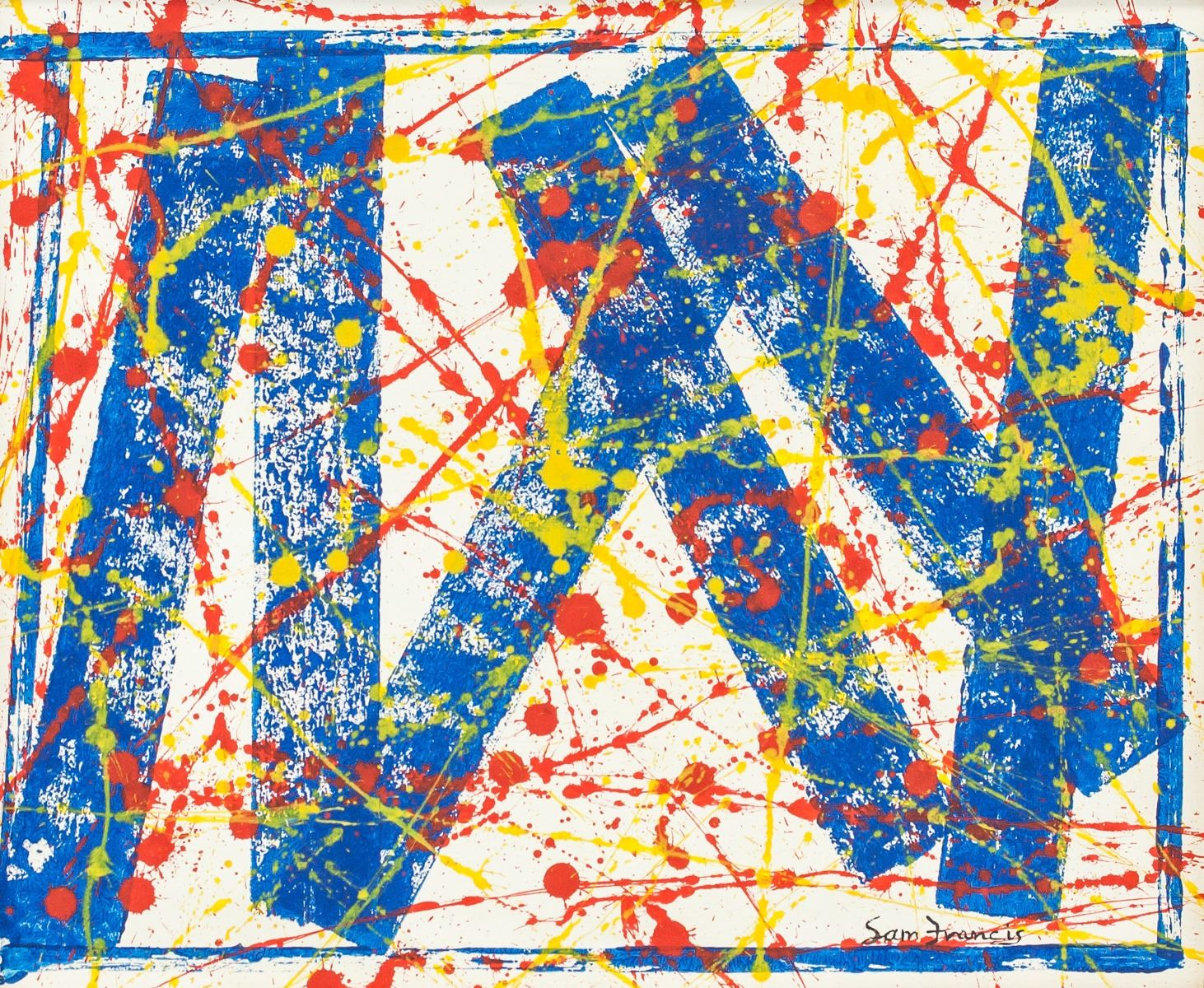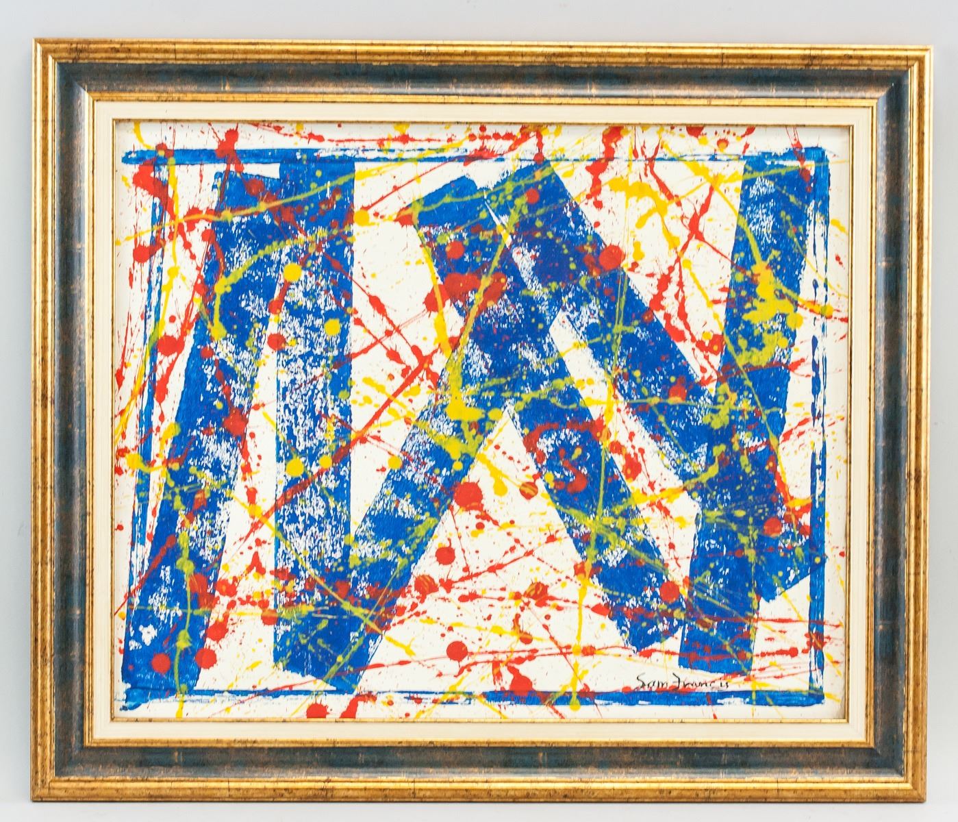 Acrylic on canvas, framed. Featuring abstract composition of blue, yellow, and red. Signed "Sam Francis" to the bottom right. Attributed to Sam Francis (19263-1994, American). 43.5 x 53.5 cm (17 x 21 in), Frame: 55 x 65 cm (21.5 x 22.5 in)