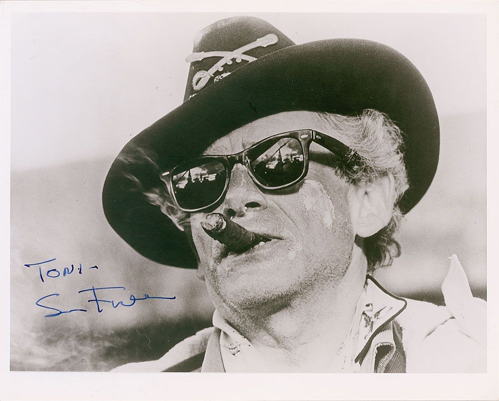 Film director (1912–1997) known for low budget films with controversial themes. Glossy 10 x 8 close-up photo of Fuller in an Air Cavalry hat and uniform, signed and inscribed in blue ink “Tony—Sam Fuller.” In fine condition.