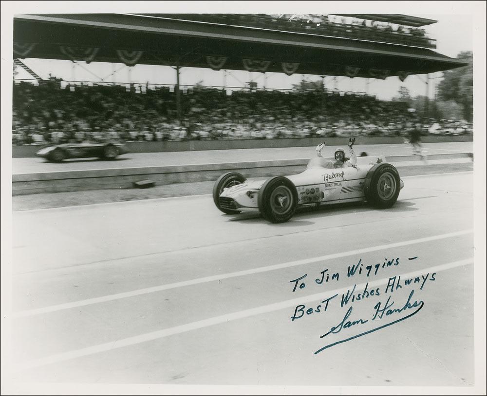 Racer (1914–1994) who won the 1957 Indianapolis 500. Glossy 10 x 8 photo taken during an Indy race, signed and inscribed in felt tip “To Jim Wiggins—Best Wishes Always. Sam Hanks.” In fine condition, with tiny creases.