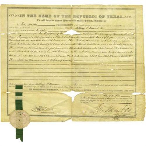 <B>Sam Houston As Texas Republic President Partially Printed Document Signed,</B></I> countersigned by Land Commissioner Thomas William Ward, one page with docketing on verso panel, vellum, 17” x 13.5”, Austin, Texas, August 22, 1844. Anthony D. Kinnard is here granted a parcel of land in Montgomery County, Texas. Affixed with the Texas General Land Office seal. Some splits, loss at intersection of folds, a few pinholes. The signatures are legible, however somewhat faded. Overall fair condition. Both of the signatories here were key players in the Texian bid for independence from Mexico. It should be noted that the Irish-born Ward lost a leg in the conflict and, later, in 1841, accidentally lost an arm during a San Jacinto victory celebration. <BR><BR><b>Shipping:</b> Flat Material, Large (<a target="_blank" href="http://www.heritageauctions.com/common/shipping.php">view shipping information</a>)