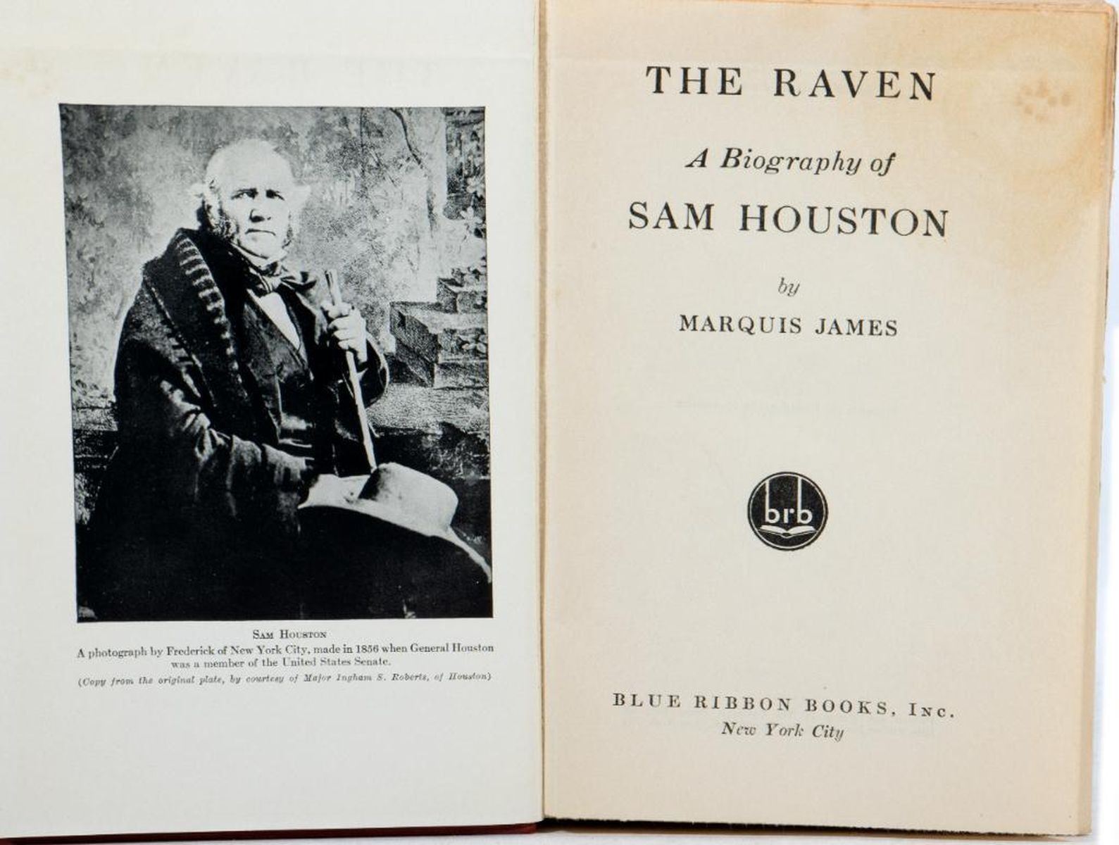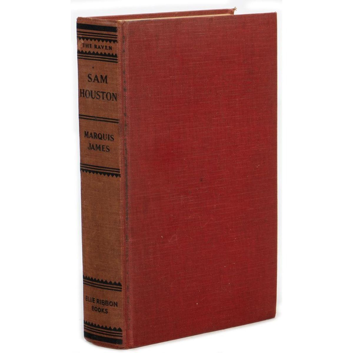 JAMES, MARQUIS. The Raven, A Biography of Sam Houston. New York: Blue Ribbon Books, Inc., 1929. A reprint of the first edition. Good; fading, owner's inscriptions.