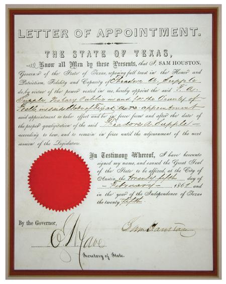 Rare and unusual partly-printed document signed ''Sam Houston'' as Governor of Texas following the state's secession from the Union on 1 February, against Houston's wishes, but before it joined the Confederacy on 2 March, at which time Houston was ousted from office. Datelined Austin, 25 February 1861, Houston appoints Theodore A. Supple as a ''…Notary Public in and for the County of Bell in said State of Texas…'' Seeing the looming conflict in 1860 Houston had warned: ''Let me tell you what is coming. After the sacrifice of countless millions of treasure and hundreds of thousands of lives you may win Southern independence, but I doubt it. The North is determined to preserve this Union.'' About a week after Houston signed this appointment, the legislature voted to formally join the Confederate States of America, an act Houston branded as illegal. On the 18th of March, 1861 he refused to take an oath of allegiance to the Confederacy and was removed from office. He refused an offer of Federal troops, responding: ''I love Texas too well to bring civil strife and bloodshed upon her. To avert this calamity, I shall make no endeavor to maintain my authority as Chief Executive of this State…'' Usual folds, else fine condition with bright red seal intact. Very attractive document.