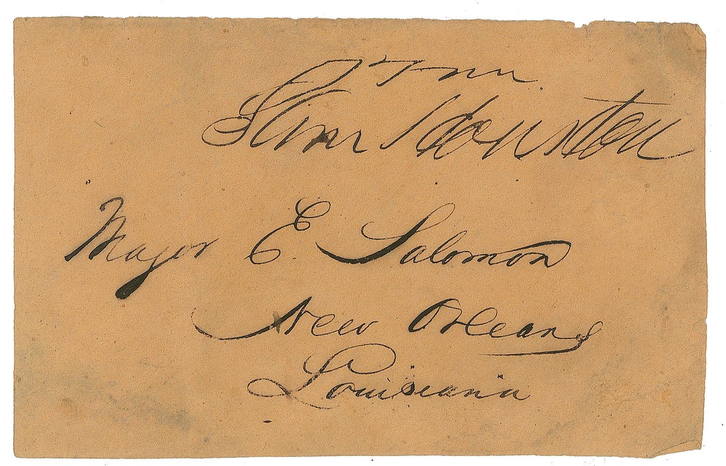 Desirable free-franked mailing panel, 5.25 x 3.25, addressed in another hand to "Major E. Salomon, New Orleans, Louisiana," and prominently franked at the top, "Free, Sam Houston." In fine condition, with light soiling.