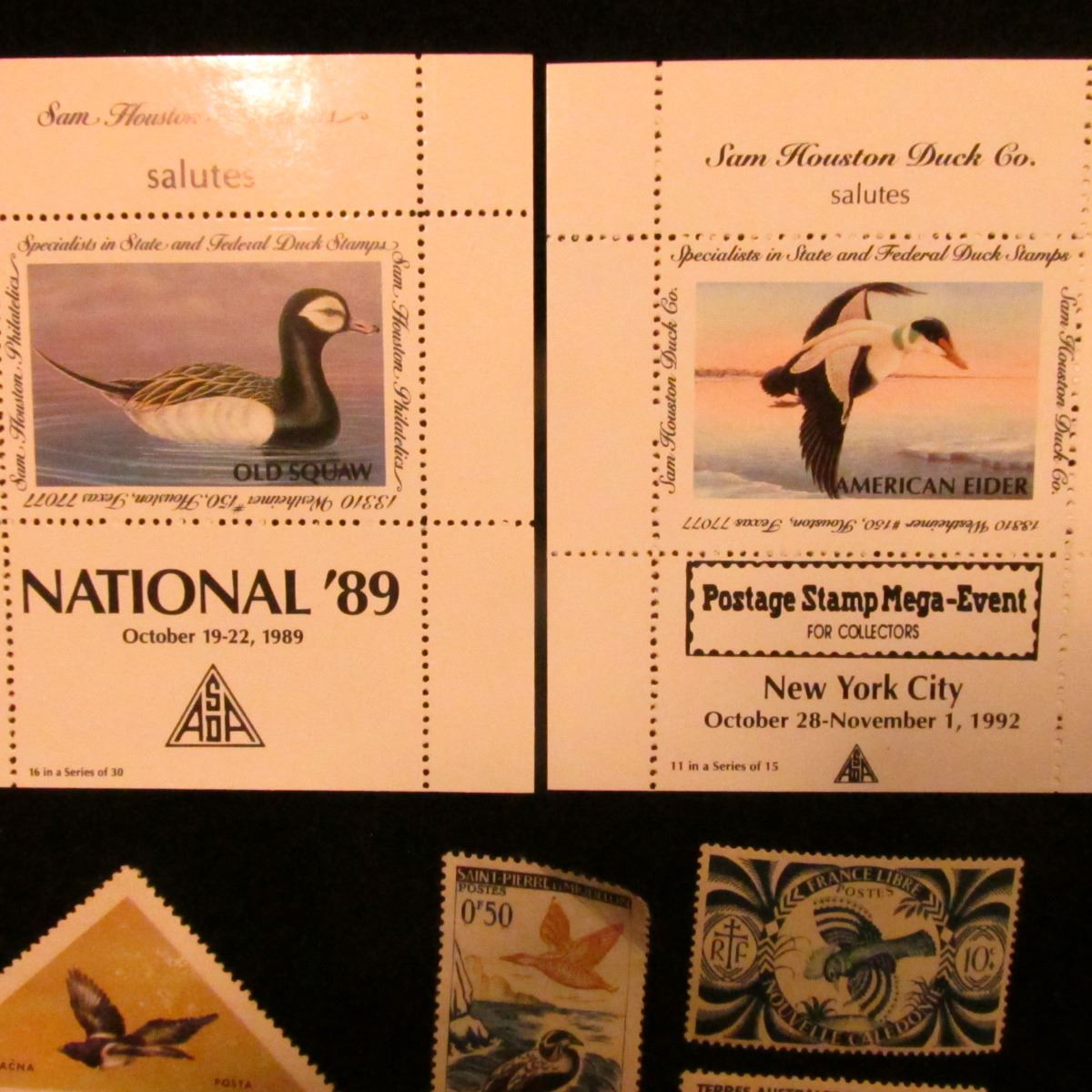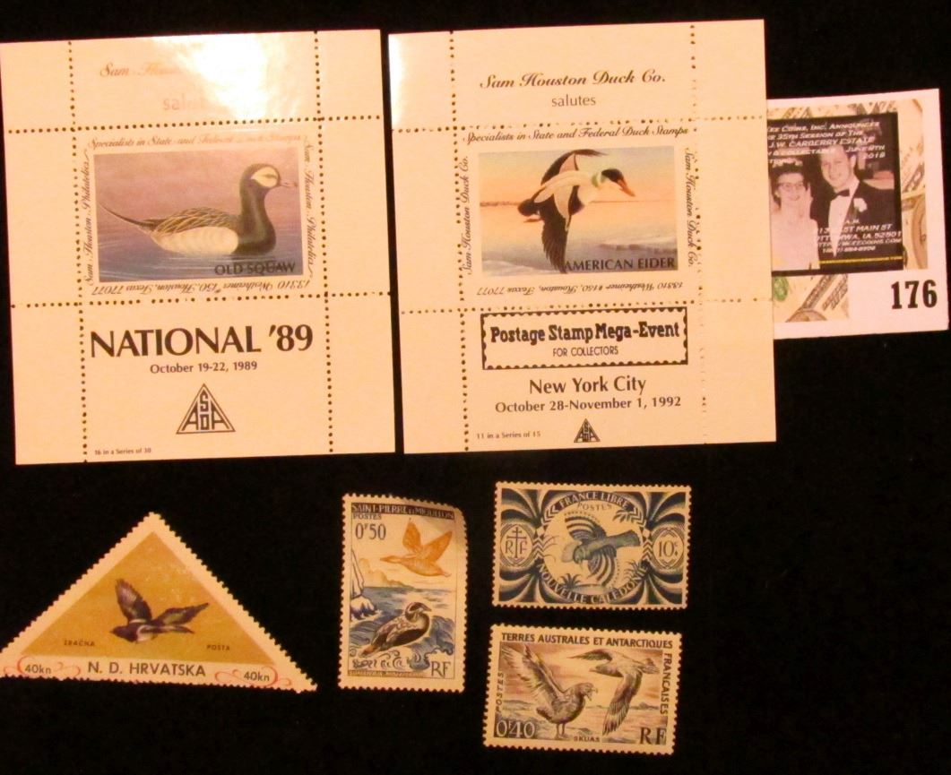 Sam Houston Philatelics Souvenir Show Labels: "National '89" depicts an Old Squaw; "Postage Stamp Mega-Event For Collectors New York City October 28-November 1, 1992" depicting an American Eider Duck; & (4) different Foreign Stamps depicting Ducks.