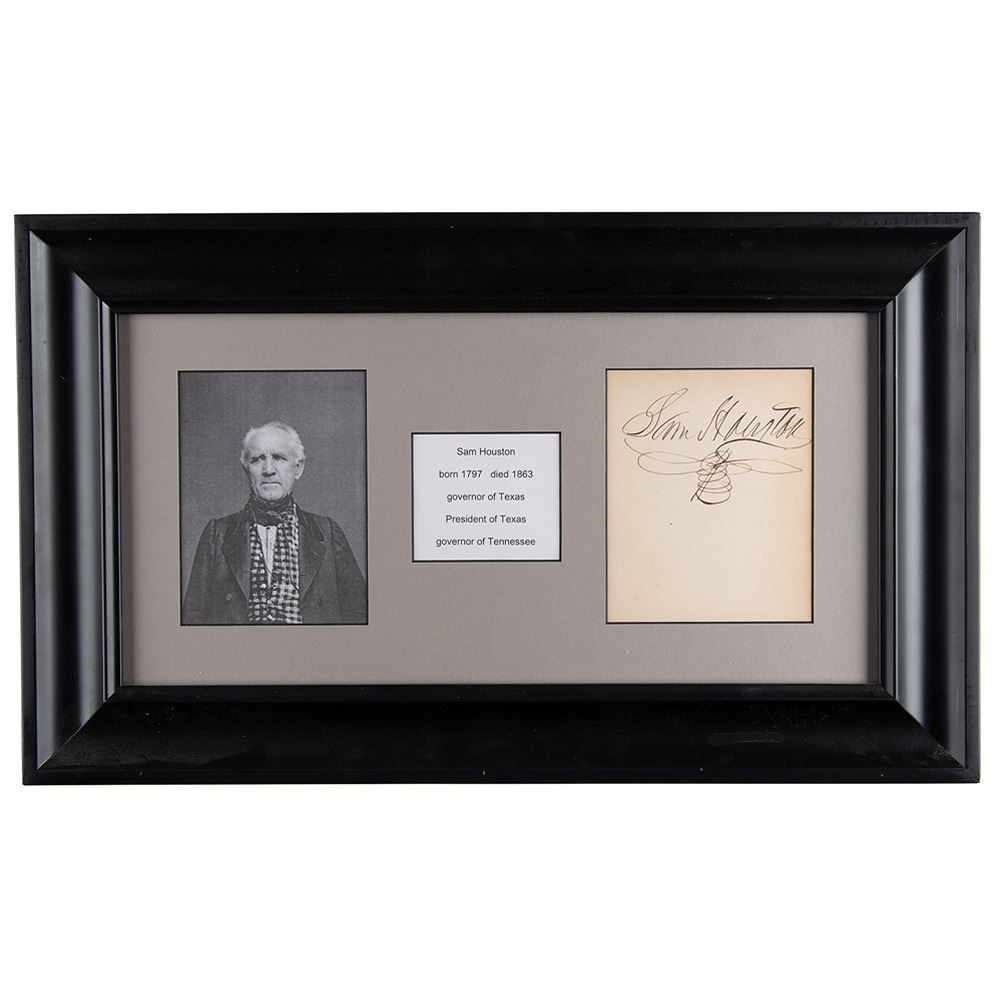 Beautiful ink signature, "Sam Houston," on an off-white 5.25 x 6.5 album page. Matted and framed with a portrait and caption to an overall size of 24.5 x 14.5. In fine condition.
