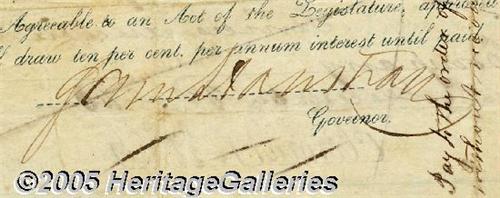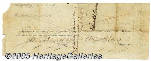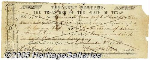 <B>Sam Houston Signed State of Texas Treasury Warrant on the Eve of the Civil War</B></I> Partly-printed document signed, "Saml. Houston" as governor of Texas on the verso of a Treasury Warrant measuring 8.5" x 3.2", dated Austin, December 3, 1860. The warrant is issued to Edward D. Evans $160.44 for "Protection of the Frontier" as part of "Capt Burlesons Company." Signed in the last months of his administration... and one month after the national election in which Houston was an oft-cited hopeful candidate. When Texas seceded from the Union on February 23, 1861, Houston was adamantly opposed to the move and refused to swear an oath to the Confederate States of America. He was deposed on March 18 and he permanently withdrew from public life. Light hand cancellation on verso does not detract from Houston's signature, tiny losses a right margin, otherwise bright and crisp. <I>Accompanied by COA from PSA/DNA.</B></I>