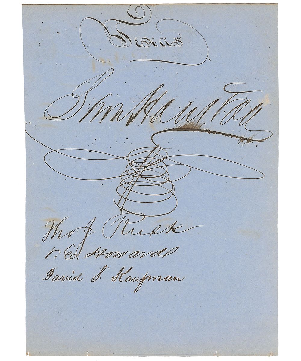 Ink signatures, “Sam Houston” and “Tho. J. Rusk,” on a light blue 5.5 x 8 album page. Also signed by fellow Texas congressmen Volney E. Howard and David S. Kaufman. In fine condition. An especially big, florid example of Houston’s desirable autograph.