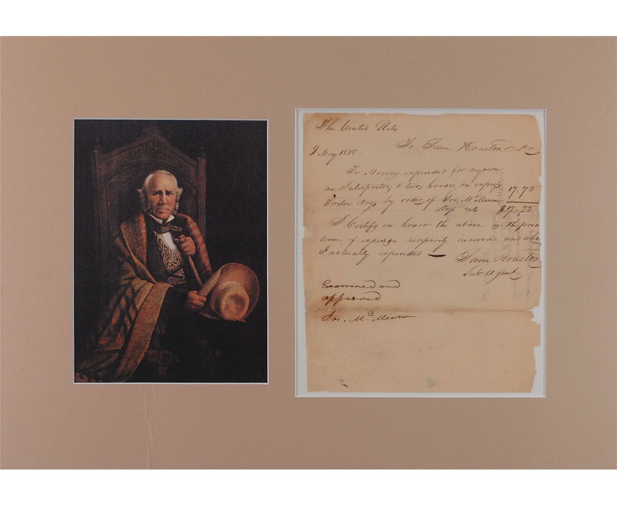 ADS, signed “Sam Houston Sub Agent,” with his signature incorporated again in the heading, one page, 7.75 x 9.25, May 9, 1818. Document for $17.75 expenses reads, “To money expended for my own, an Interpreter & two horses, on express twelve days by order of Gov. McMinn. I certify on honor the above is the price sum of expense necessarily incurred and what I actually expended.” Matted with a color image of Houston to an overall size of 21 x 15. In very good condition, with several repairs to separations and areas of paper loss, intersecting folds, paper loss to edges, and show-through from docketing on reverse.
